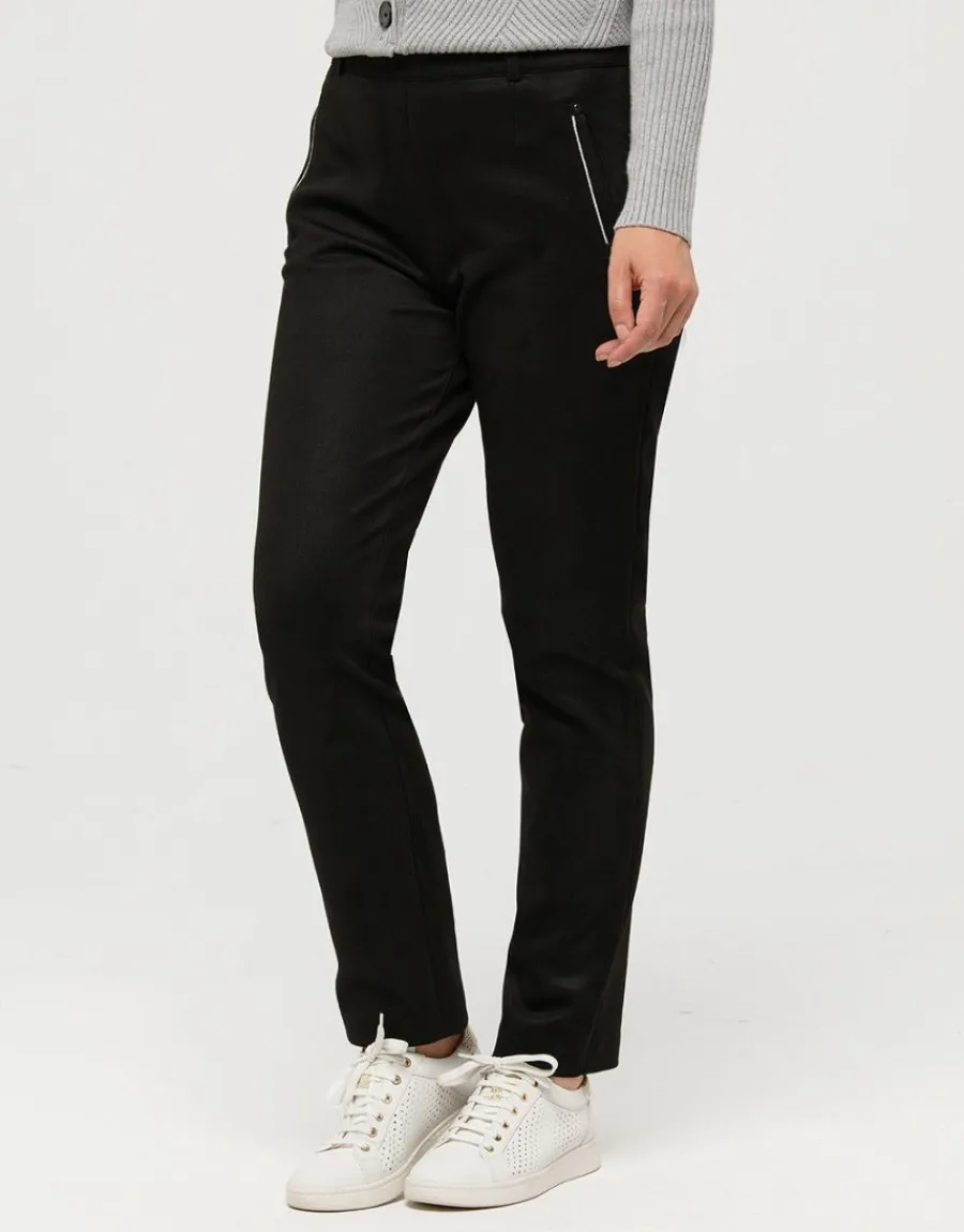 Le Jegging en suédine noir, un incontournable de la garde-robe pour un look tendance et confortable. Les jambes ajustées et la longueur 7/8ème apportent une touche moderne à ce pantalon. La taille regular entièrement élastiquée avec un élastique plat noir et des fils métallisés assure un ajustement parfait. La suédine stretchée offre un confort optimal tout en ajoutant une touche d’élégance. Les 2 poches passepoilées sur les côtés bordées d’un liseré argent apportent une touche d’originalité à ce jegging. Le tissu suédine façon « daim » offre une douceur incomparable. La profondeur du noir de ce pantalon en suédine et sa coupe impeccable en font un essentiel pour des looks parfaits. Que ce soit pour une soirée ou une journée au bureau, ce jegging saura vous satisfaire. La coupe cigarette légèrement raccourcie apporte une touche de modernité, tandis que les liserés argent des poches ajoutent une touche d’éclat. Emma, qui mesure 1,76m, porte du 38 et met en valeur ce jegging avec style. Associez-le de manière décontractée mais élégante avec le pull bicolore (E0244) ou optez pour un look plus glamour avec le pull glitter bleu (E0625) et une sublime paire d’escarpins. La composition en 93% polyester et 7% élasthanne garantit une grande liberté de mouvement, tandis que la doublure en 100% polyester assure un confort optimal. Avec une longueur de 95 cm pour la première taille, ce jegging en suédine noir est un choix parfait pour toutes les occasions.