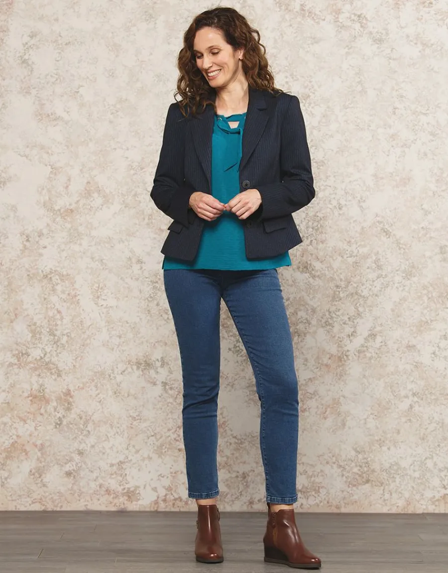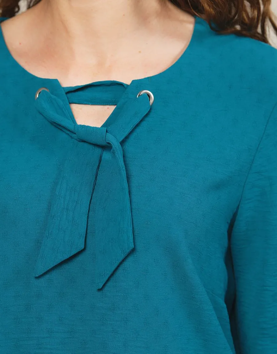 La blouse bleu chic est un incontournable de la garde-robe féminine. Son encolure en V met en valeur le décolleté, tandis que l’œillet argenté avec cordon apporte une touche d’élégance au col. Les plis d’aisance à l’arrière offrent un confort optimal tout en ajoutant une touche de sophistication à la pièce. La couleur bleue de cette blouse est à la fois intemporelle et tendance, facile à assortir avec d’autres pièces de votre dressing. Que ce soit pour une journée de travail ou une soirée entre amis, cette blouse sera votre alliée mode. Mesurant 1,76m, Kristell porte du 38 et met en valeur la coupe de cette blouse. Fabriquée à partir de 100% de polyester, cette blouse est à la fois légère et agréable à porter. Avec une longueur de 64 cm pour la première taille, elle s’adaptera parfaitement à votre morphologie. Optez pour la blouse bleu chic pour un look à la fois classique et moderne, parfait pour toutes les occasions.
