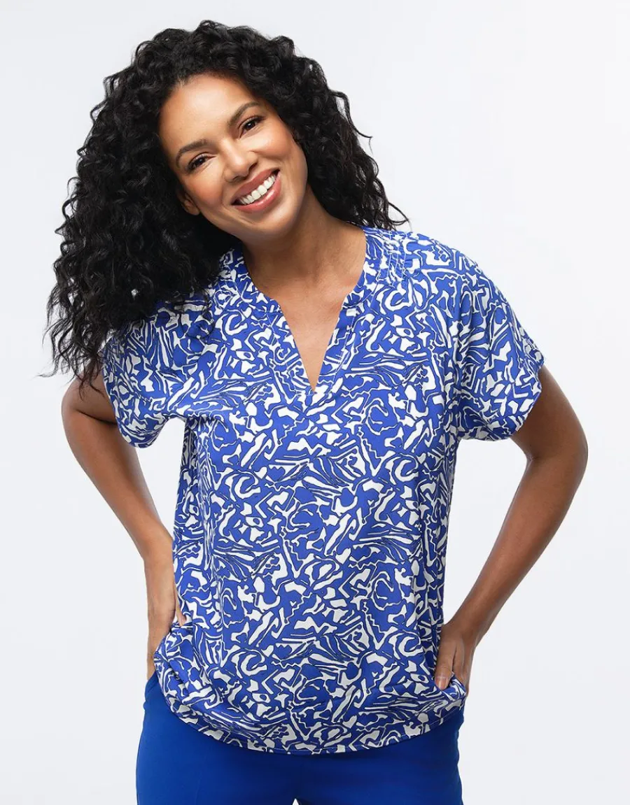 Cette blouse habillée, signée par la marque Christine Laure, se décline en un élégant bleu roi et blanc, apportant une touche de sophistication à votre garde-robe. Avec sa coupe droite, elle offre une silhouette fluide qui flatte de nombreux types de morphologies. Le col officier dégagé et l’encolure en V créent un décolleté délicat, tandis que les manches courtes assurent une agréable légèreté, idéale pour les journées ensoleillées. Les détails smocks au niveau des épaules ajoutent une touche de charme tout en soulignant l’originalité du modèle. Cette blouse se distingue par sa fluidité et sa légèreté, convenant aussi bien pour des occasions habillées que pour des sorties décontractées. Juliana, qui mesure 1,76m, porte ici la taille 1, illustrant ainsi le tombé élégant de la pièce. Avec une longueur de 63 cm pour la première taille, cette blouse est parfaitement adaptée pour être associée à un pantalon ou une jupe. Sa facilité d’entretien en fait un choix pratique pour les femmes modernes qui désirent allier élégance et confort au quotidien.