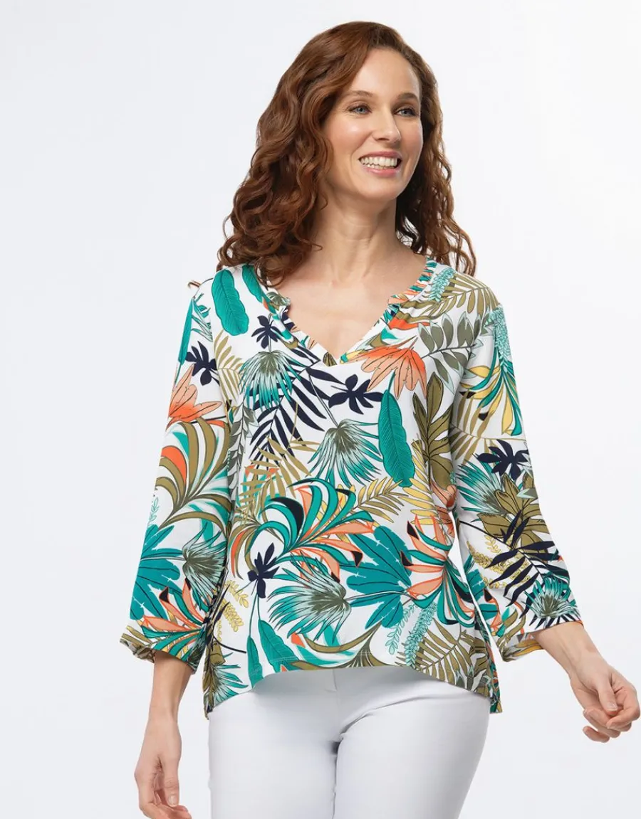 Découvrez la blouse imprimée tropicale de Christine Laure, un incontournable de la saison. Cette pièce se distingue par sa coupe droite et vaporeuse, qui offre un confort optimal tout en mettant en valeur la silhouette. L’encolure en V souligne élégamment le cou et apporte une touche de sophistication. Dotée de manches 3/4, elle permet de jouer avec les superpositions tout en restant adaptée à diverses occasions. À l’arrière, des plis creux ajoutent une note de raffinement, créant un mouvement fluide à chaque mouvement. Le tissu est entièrement en viscose, garantissant une texture douce et agréable sur la peau, idéale pour les journées ensoleillées ou pour les soirées détendues. La blouse mesure 63 cm en longueur pour la première taille, permettant un ajustement flatteur pour plusieurs morphologies. Kristel, mannequin de 1,76 m, porte une taille 1, illustrant parfaitement le style décontracté et élégant de cette blouse. Associez-la à un pantalon léger ou une jupe pour un look estival plein de fraîcheur. Que ce soit pour sortir entre amis ou pour une occasion spéciale, cette blouse saura s’adapter à toutes vos envies, tout en évoquant une atmosphère tropicale.