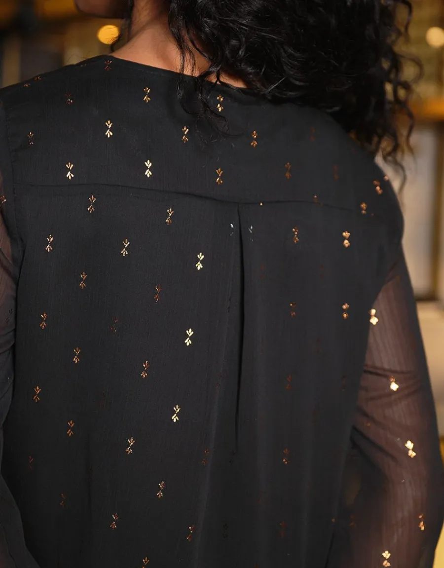 – Blouse noire à motifs métallisés cuivre