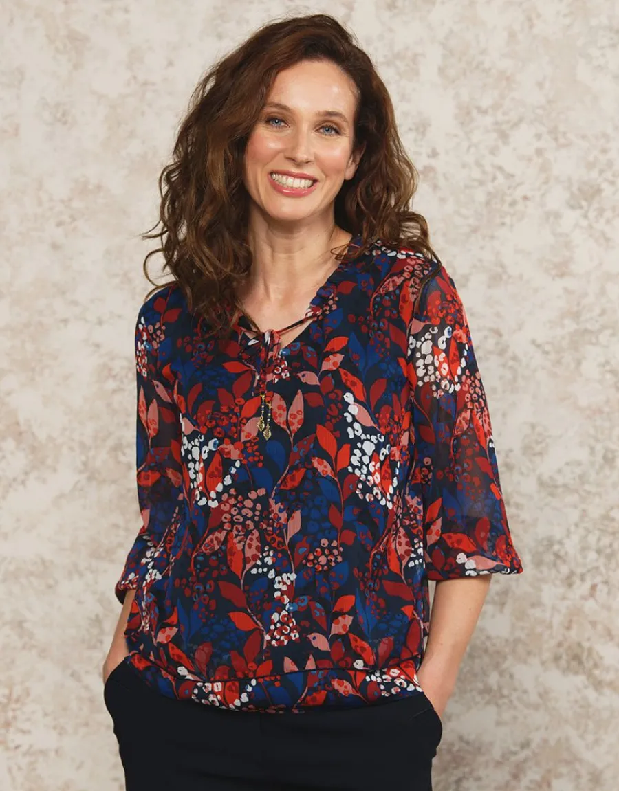– Blouse fluide en voile imprimé orange/rouge sur fond bleu