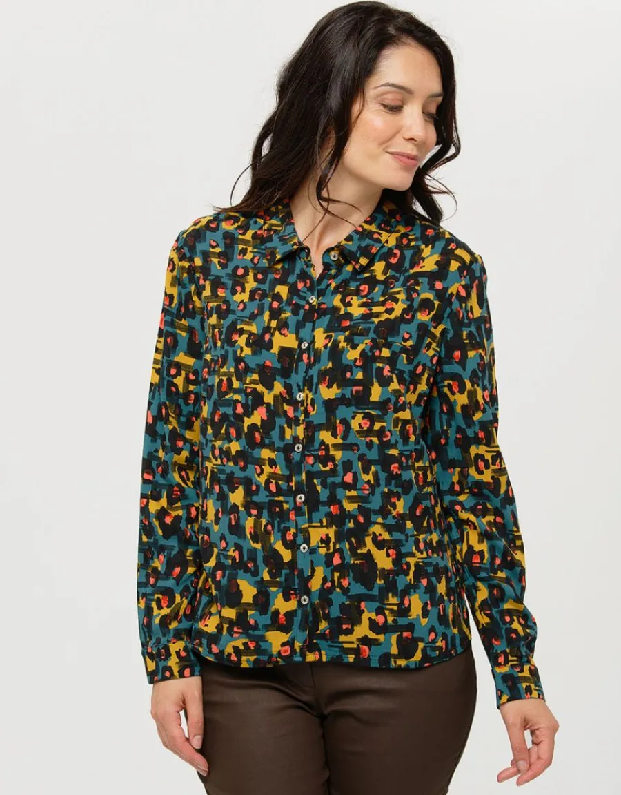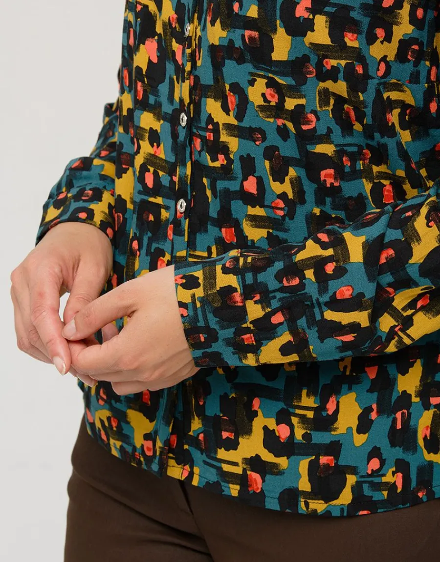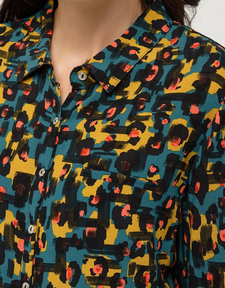 – Une touche de léopard orangé sur un fond bleu canard et ocre, voici une chemise que vous allez pouvoir associer avec facilité
