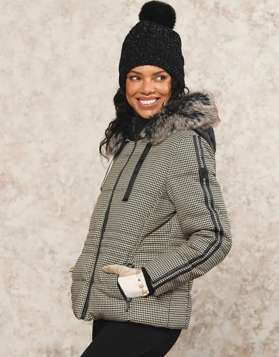 La « Doudoune pieds de poule » est un véritable bijou de la mode hivernale. Son imprimé pieds de poule noir et beige, rehaussé par des fils dorés, apporte une touche d’élégance et de sophistication à votre tenue. Sa coupe droite légèrement ajustée par un jeu de matelassage à la taille mettra en valeur votre silhouette tout en vous tenant bien au chaud. Cette doudoune courte est dotée d’une capuche et d’une fausse fourrure amovible, vous permettant de l’adapter à vos envies et à la météo. Les poches zippées à l’avant et le fond polaire vous offrent un confort optimal et une praticité au quotidien. Le contraste entre le doré et le vernis apporte une touche de brillance et de modernité à cette pièce incontournable de votre garde-robe d’hiver. Que ce soit pour une sortie en ville ou une escapade à la montagne, la « Doudoune pieds de poule » saura vous accompagner avec style et élégance. Kristel, qui mesure 1,76m, porte du 38 et met en valeur cette doudoune avec une aisance naturelle. Sa composition en viscose, polyester, fibres métallisées et élasthanne assure un confort optimal, tandis que la ouatine et la fausse fourrure en polyester vous tiendront bien au chaud même lors des journées les plus froides. Avec une longueur de 66 cm pour la première taille, cette doudoune est idéale pour affronter l’hiver avec style et féminité. Ne passez pas à côté de cette pièce tendance et chic qui saura vous accompagner tout au long de la saison froide.