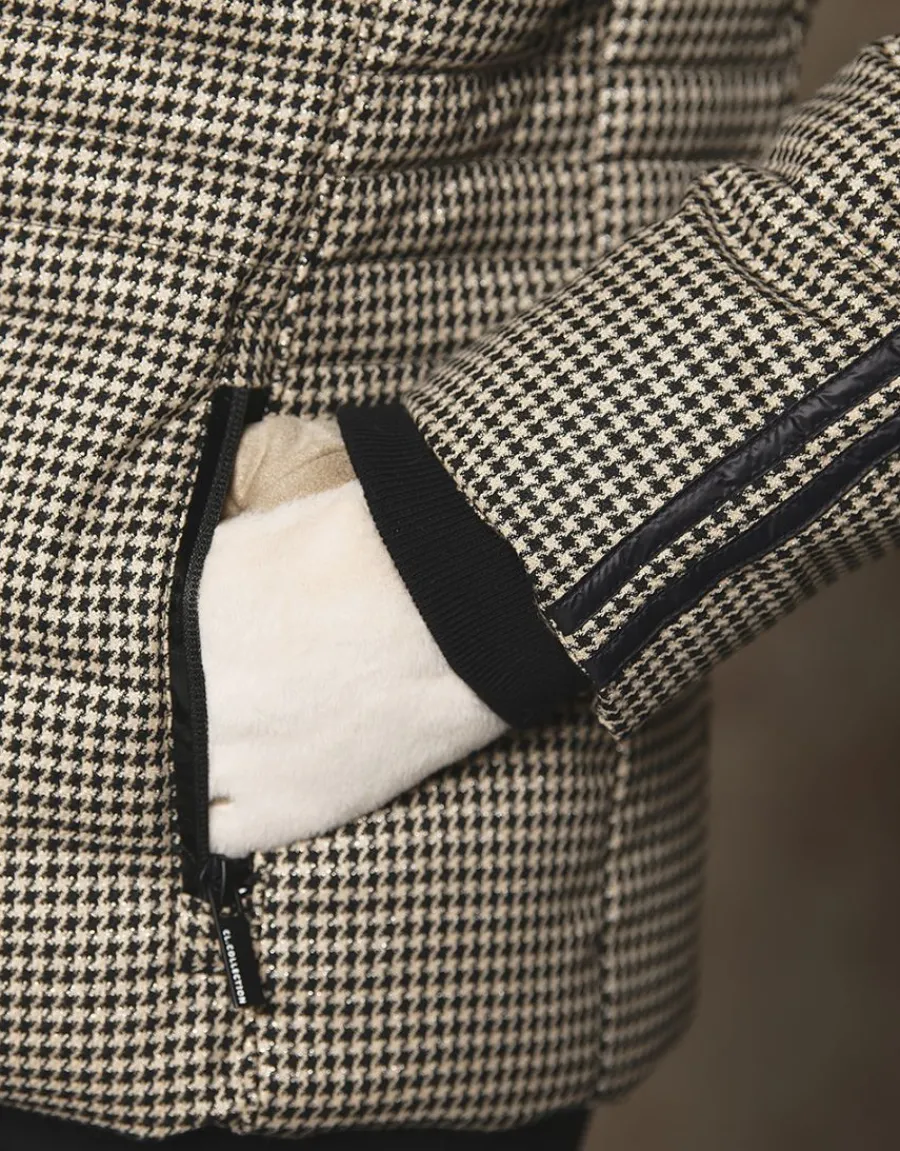 – Imprimé pieds de poule noir et beige avec insertion de fil doré