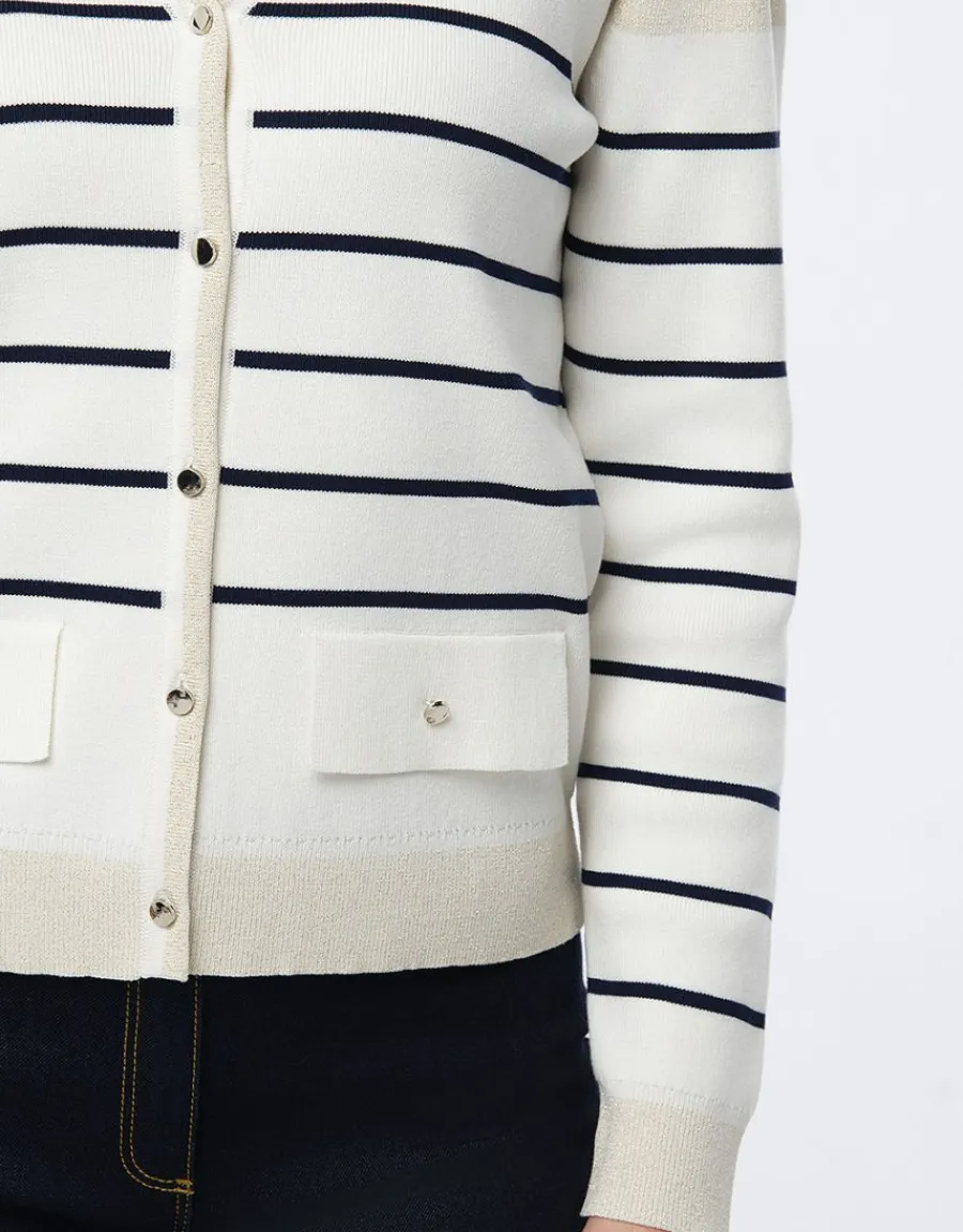 Découvrez le gilet marinière col V de Christine Laure, une pièce élégante qui marie confort et style. Son design à la fois classique et moderne se distingue par sa coupe droite et ses manches longues, offrant une silhouette flatteuse. Réalisé dans une maille compacte, ce gilet présente des rayures inspirées du style marin, agrémentées d’un subtil fil métallisé doré qui lui confère une touche d’éclat. L’ouverture avant est dotée de cinq boutons, soulignant le soin apporté aux détails. De plus, deux rabats de poche ornés de boutons argentés ajoutent une note de sophistication à l’ensemble. Mesurant 58 cm de longueur pour la taille 1, il convient parfaitement à différentes morphologies. Que ce soit pour une tenue décontractée ou un look un peu plus chic, ce gilet s’adapte aisément à toutes les occasions. Sa composition garantit à la fois confort et durabilité. Kristel, mesurant 1,76 m, le porte en taille 1, illustrant ainsi l’ajustement idéal. Ce gilet est un choix parfait pour celles qui cherchent à allier style intemporel et modernité dans leur garde-robe.