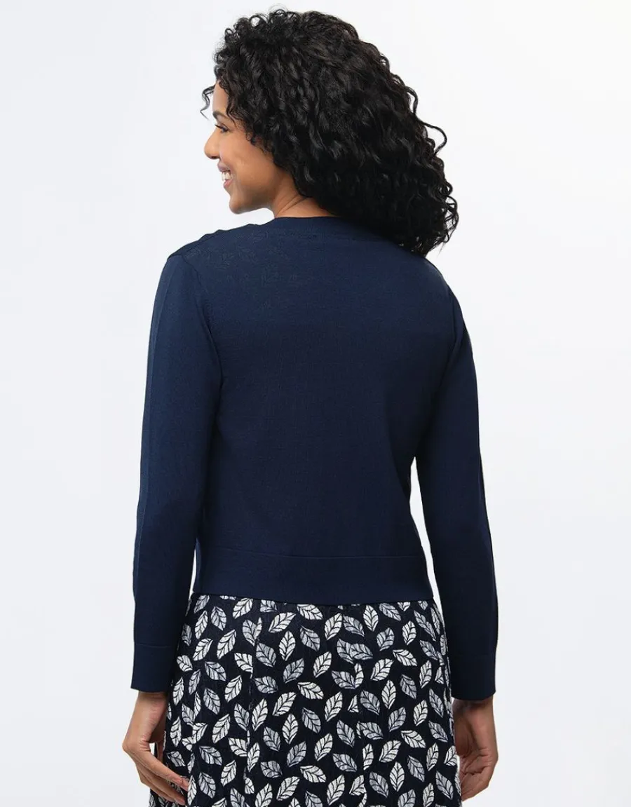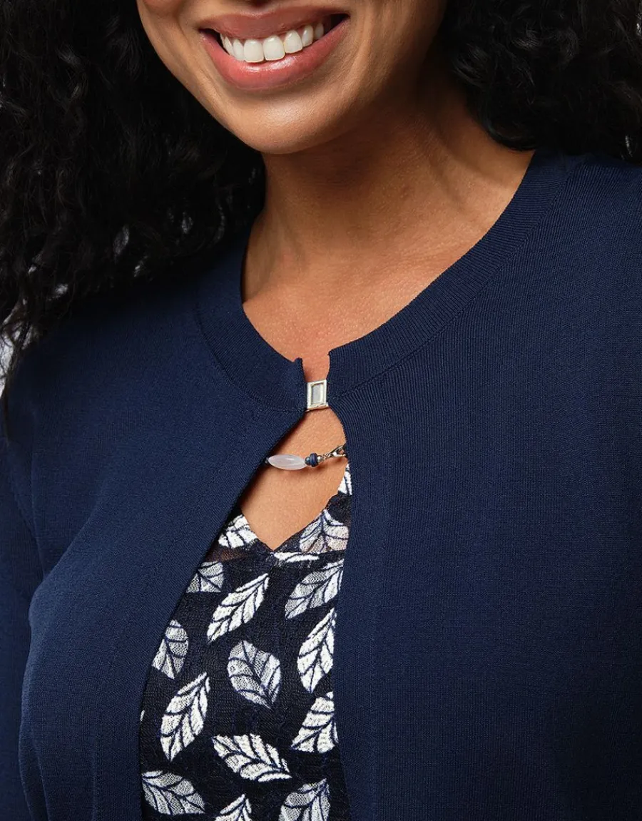Le boléro en maille bleu marine de Christine Laure incarne l’élégance et la sophistication d’une pièce intemporelle. Sa conception présente une encolure ronde délicate, offrant à la fois un confort optimal et une allure chic. Les manches longues embellissent le silhouette tout en apportant une subtile touche de chaleur lors des soirées fraîches. Sa coupe droite et courte met en valeur la taille, permettant une grande liberté de mouvement et ajoutant une note moderne à n’importe quelle tenue. La fermeture, réalisée par un petit crochet argenté, assure une certaine originalité tout en restant pratique. Ce boléro est sublimé par des détails raffinés tels que les deux rabats sur le devant, qui soulignent son design soigné. Confectionné dans une maille légère, il se drape avec élégance sans alourdir l’ensemble. Juliana, mesurant 1,76 m, porte une taille 1, illustrant à merveille l’adaptabilité de cette pièce aux différentes morphologies. Avec une longueur de 50,5 cm pour la première taille, le boléro se prête aussi bien à des occasions formelles qu’informelles, offrant un complément parfait à une robe élégante ou à un débardeur simple avec un pantalon. L’association du confort et du style en fait un incontournable du dressing moderne. Adoptez ce boléro pour égayer vos tenues tout en restant fidèle à une esthétique raffinée.