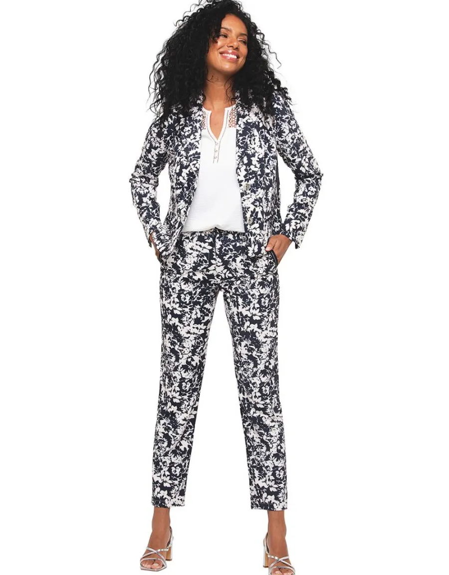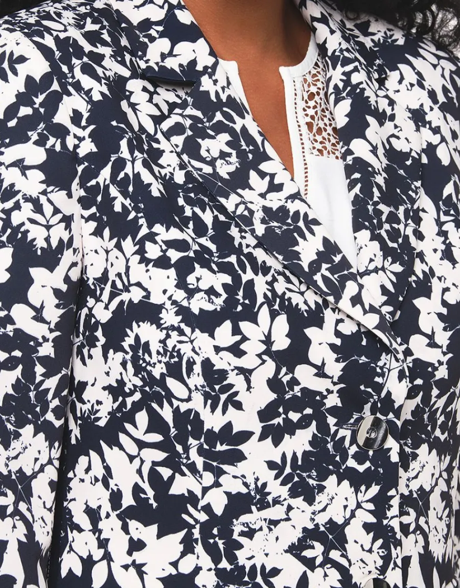 – Un imprimé feuillage bleu marine foncé et beige très élégant, voilà une veste chic à porter pour toutes les saisons