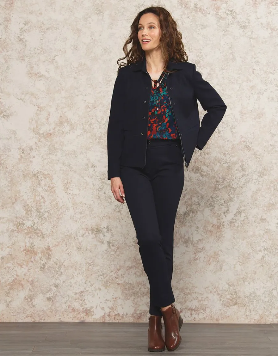La veste tailleur marine est un incontournable de votre garde-robe. Confectionnée dans un élégant sergé stretch façon Milano, elle offre un tombé impeccable et une grande liberté de mouvement. Les découpes soigneusement placées à l’avant et à l’arrière soulignent la silhouette avec finesse, tandis que la coupe droite apporte une touche de modernité. Le col en pointe et les poches discrètes à l’avant ajoutent une note sophistiquée à l’ensemble. La doublure unie fantaisie apporte une touche d’originalité à cette pièce classique, tandis que les finitions invisibles témoignent du souci du détail apporté à sa réalisation. Cette veste est confectionnée dans une matière qui saura vous séduire par son confort inégalé et son élégance intemporelle. Portée par Kristel, qui mesure 1,76m et porte du 38, cette veste tailleur marine est disponible dans différentes tailles pour s’adapter à toutes les morphologies. Composée à 47% de viscose, 46% de polyamide et 7% d’élasthanne, elle assure une grande souplesse et une excellente tenue. Sa doublure en polyester garantit un confort optimal tout au long de la journée. Avec une longueur de 58 cm pour la première taille, cette veste tailleur marine se porte aussi bien avec un pantalon de tailleur assorti pour un look professionnel impeccable, qu’avec un jean et des baskets pour une allure décontractée et tendance. Polyvalente et élégante, elle s’adapte à toutes les occasions et vous accompagne avec style en toutes circonstances.