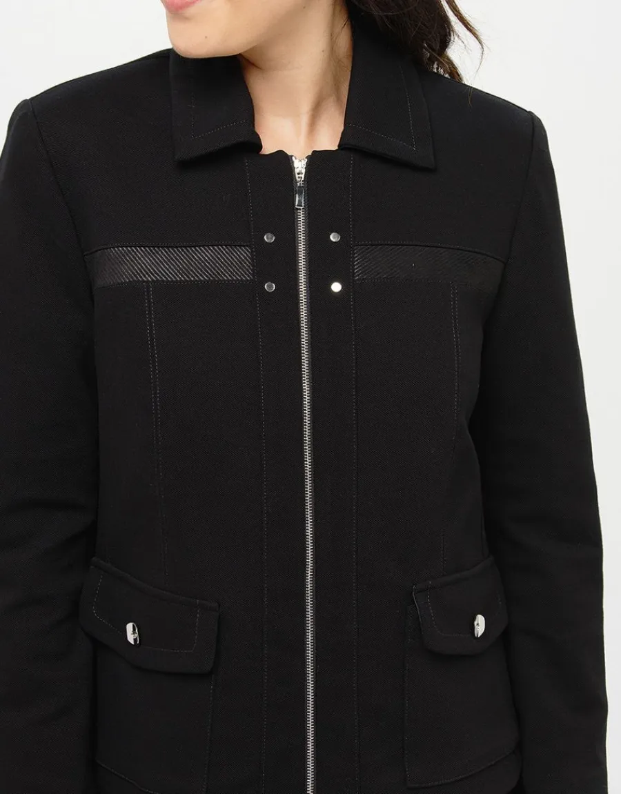 – Une très belle pièce que cette veste zippée, structurée par des surpiqures verticales et des jeux de matières
