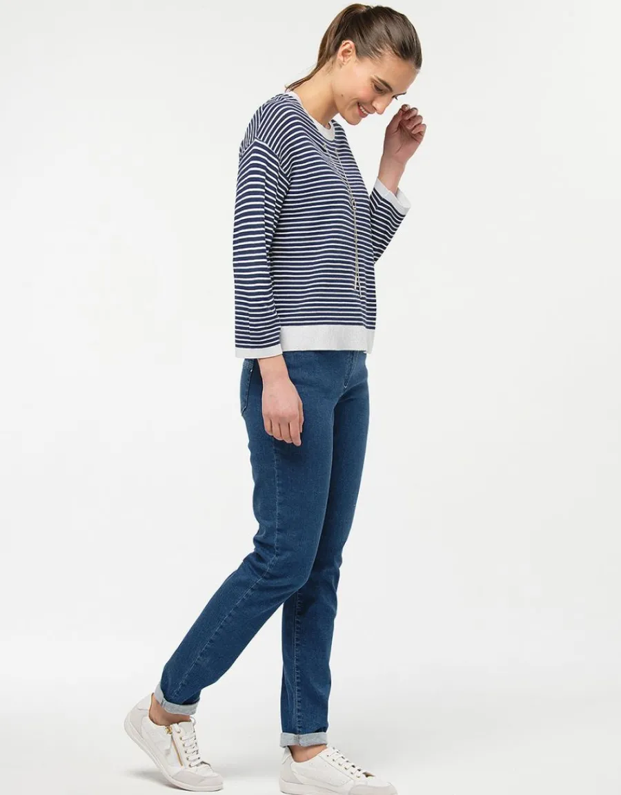 Sans surprise, ce jean matche parfaitement avec notre pull rayé à collier intégré (23ED4225021) mais aussi avec la veste courte beige (23ED4278066) porté avec le tee-shirt à motif végétal (23ED4157005).