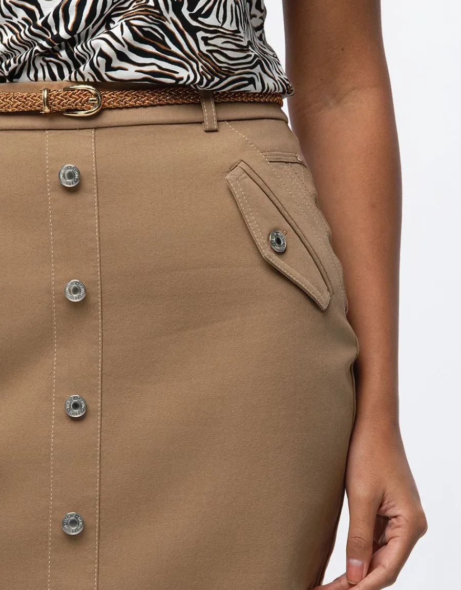 Découvrez cette jupe en coton effet jean beige, alliant confort et élégance. Sa coupe droite flatte la silhouette, tandis que la ceinture plate entièrement élastiquée assure un maintien optimal tout en garantissant une sensation agréable au quotidien. Deux fausses poches à l’avant ajoutent une touche de style, accompagnées de rabats et de boutons pour une finition soignée. Les cinq boutons argentés sur le devant apportent une note d’élégance discrète, tandis que les surpiqûres fantaisies soulignent le souci du détail. Fabriquée à partir d’un tissu stretch composé de coton, cette jupe promet une liberté de mouvement tout au long de la journée. Julie, mesurant 1,76 m, porte une taille 1, soulignant ainsi l’effet polyvalent de ce modèle. Veuillez noter que la jupe est vendue sans ceinture, mais elle se marie aisément avec divers accessoires pour compléter votre tenue. Avec une longueur de 56 cm pour la première taille, ce modèle signé Christine Laure s’intégrera facilement à votre garde-robe, se prêtant à de nombreuses occasions tout en restant intemporel dans son style.
