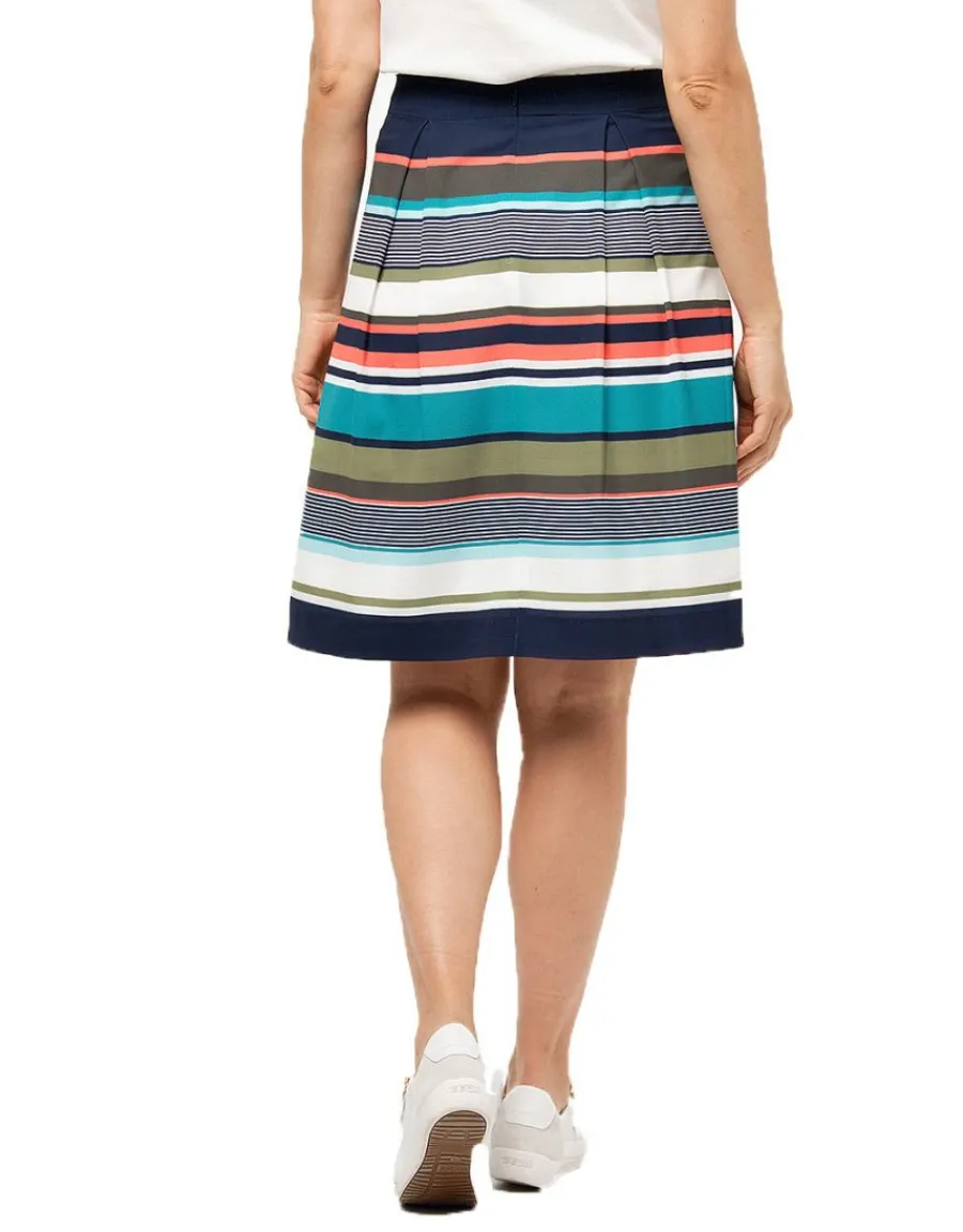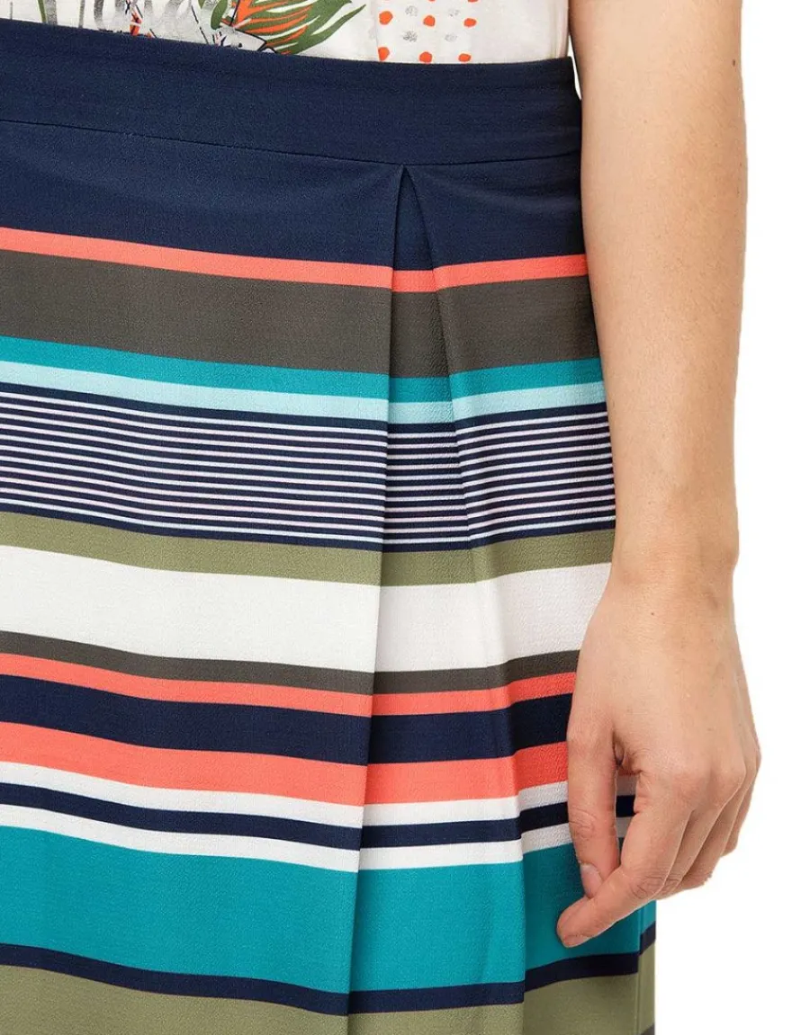 Crush total pour cette jupe rayée dont les couleurs nous emballent : marine, bleu, ciel, turquoise, kaki et corail ! C’est dire si vous allez pouvoir vous amuser à créer des looks. On aime la simplicité de la forme, doucement évasée, grâce aux plis creux qui partent de la taille, pour une allure dansante.