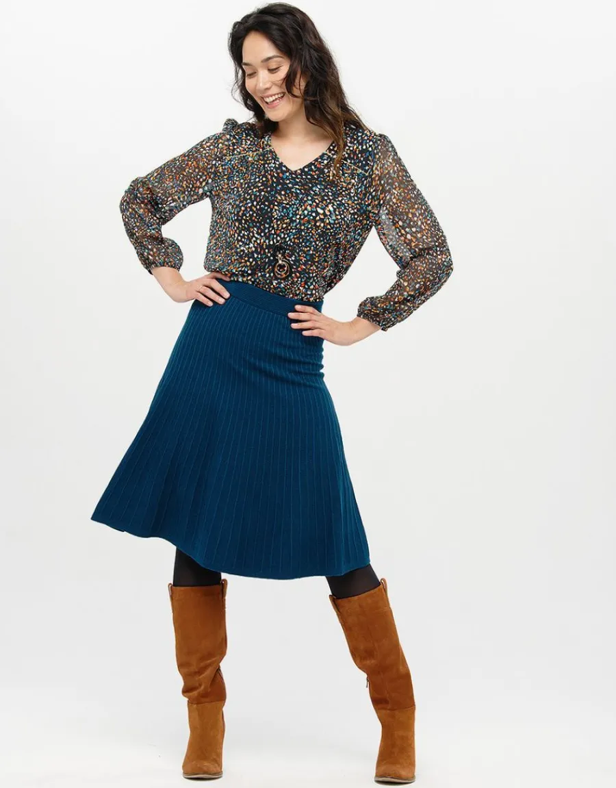 – Jupe plissée en maille bleue.
