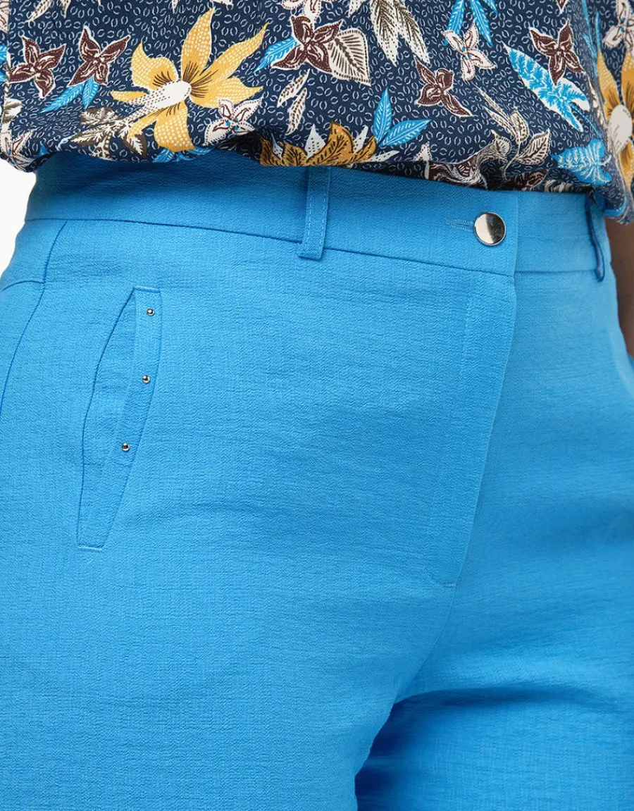 L’été c’est la saison des couleurs gaies et franches. Notre pantacourt bleu azur est coupé dans une toile stretchée, facile d’entretien et confortable, avec une longueur raccourcie mais toujours les détails chics des petits clous sur les poches avants. Sobre et élégant, c’est tout nous !