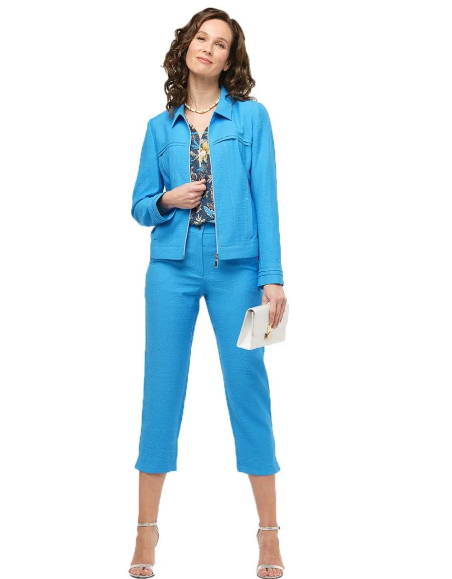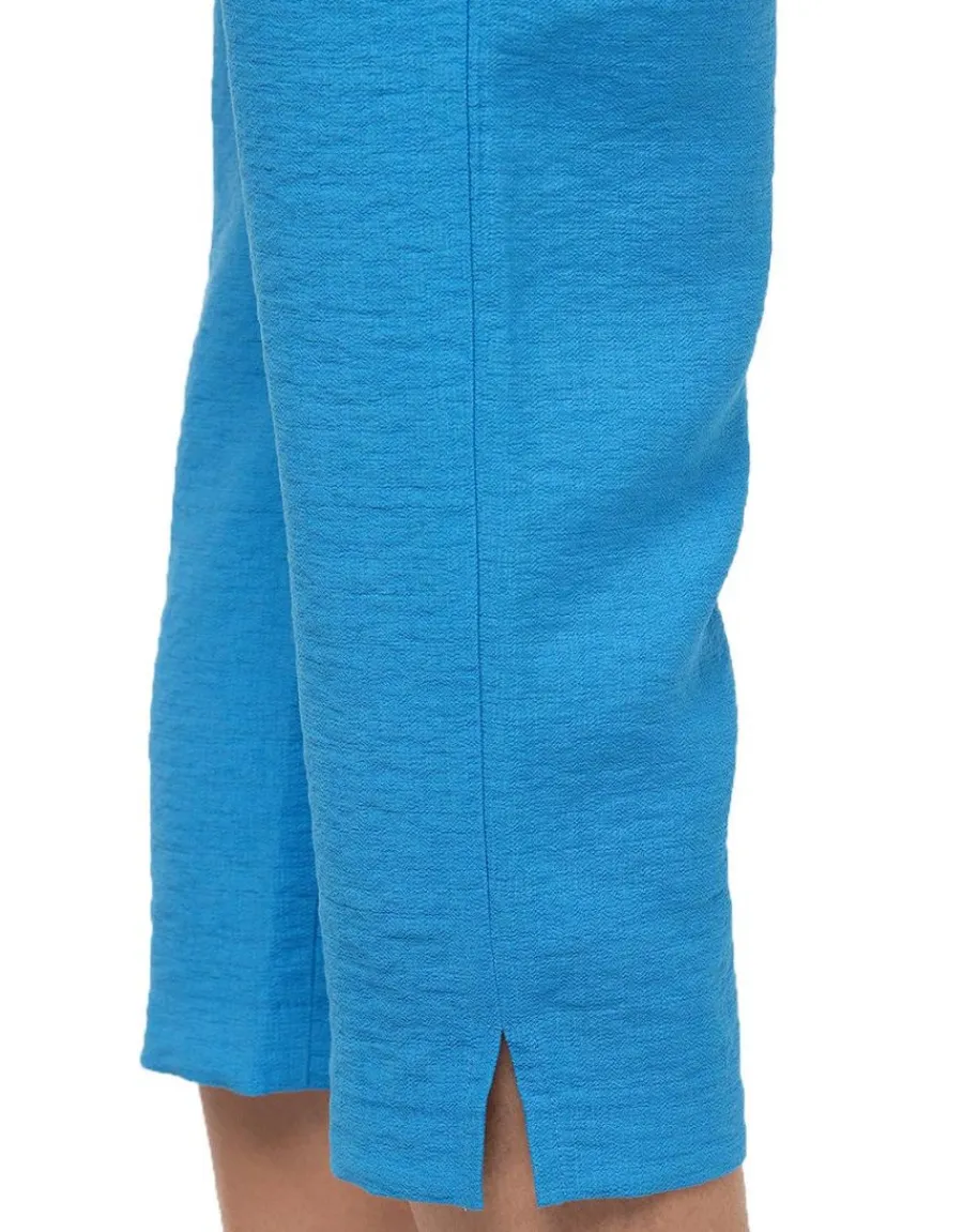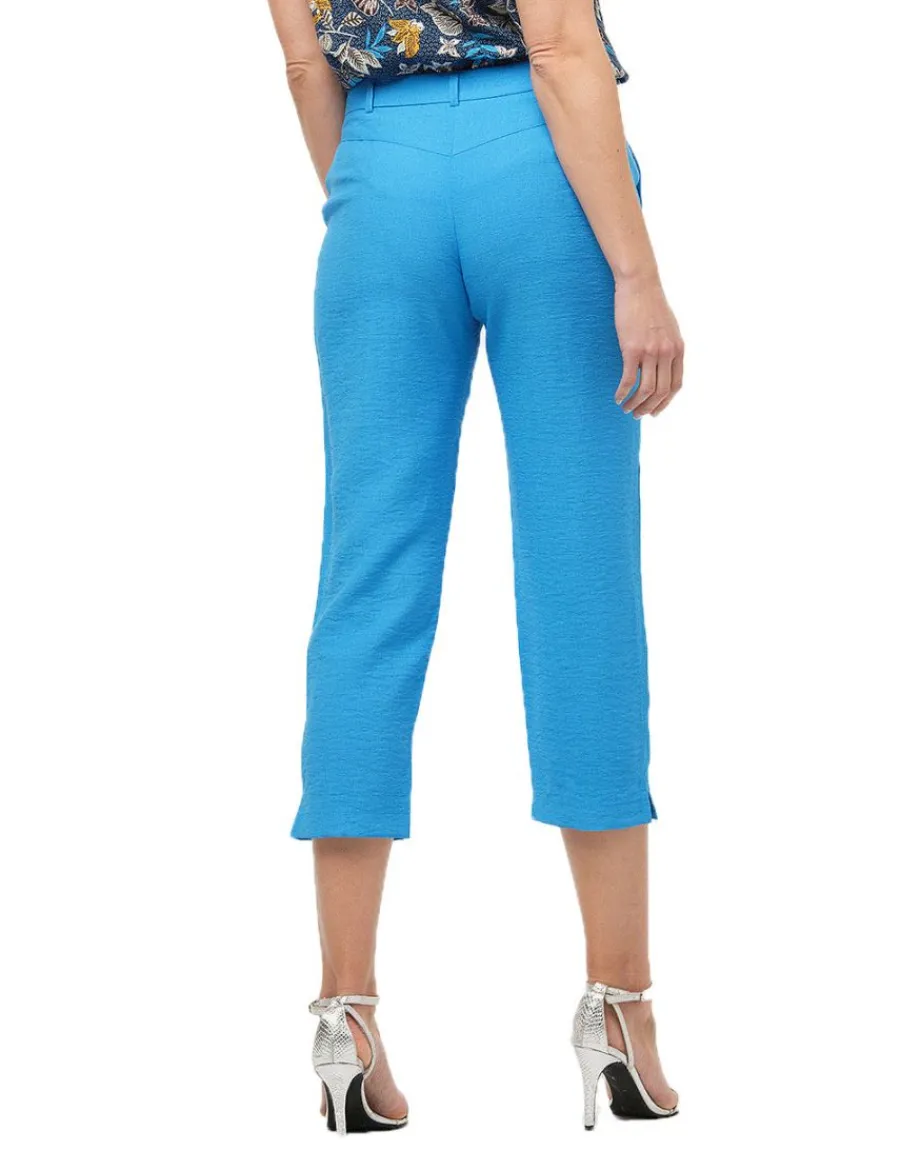 – Bon pied, bon look avec ce pantacourt bleu azur au porté très agréable.