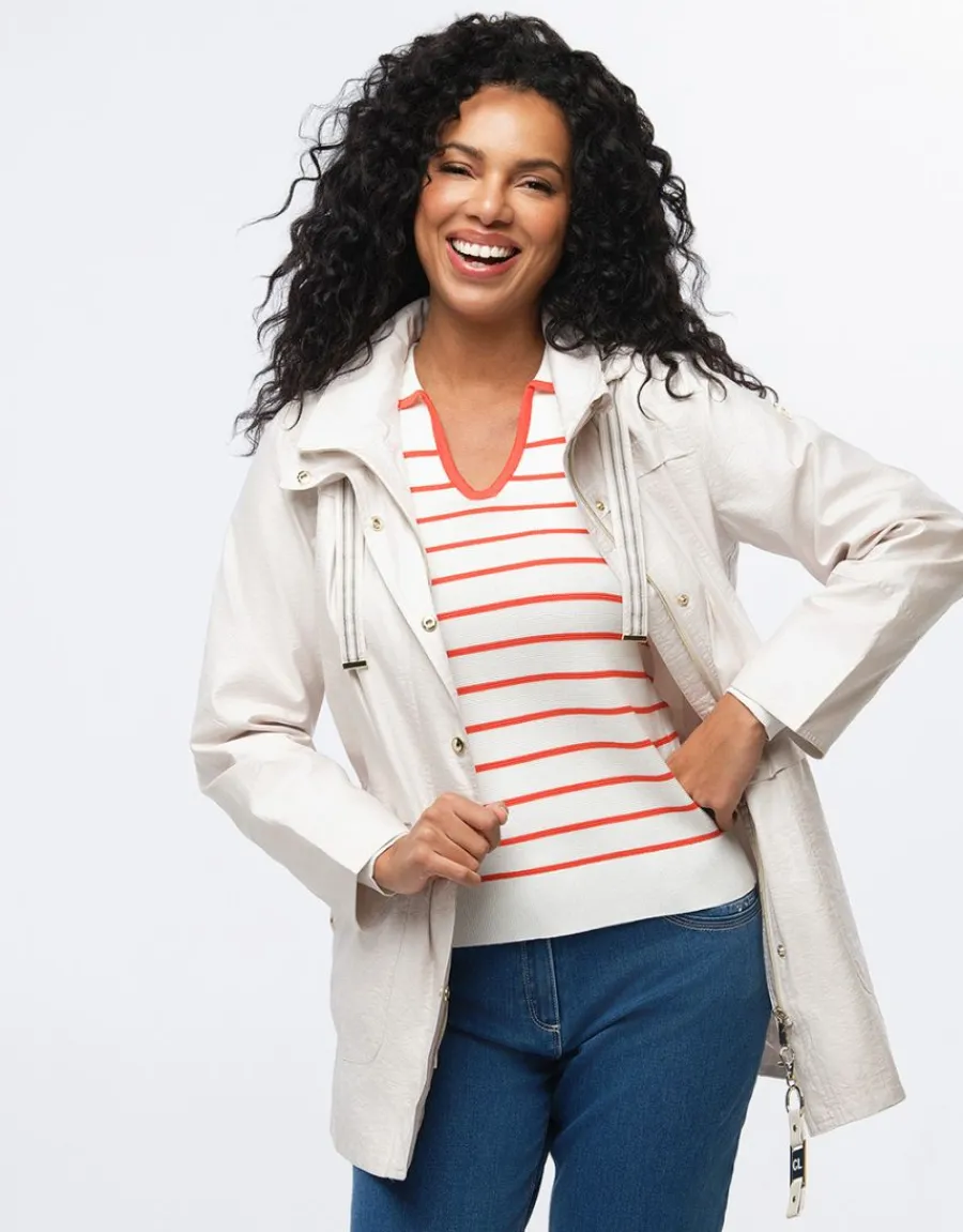 La parka légère à capuche beige effet nacré de Christine Laure allie style et praticité. Sa coupe droite et moderne est agrémentée de liens de resserrage discrets à l’intérieur, permettant un ajustement personnalisé. La fermeture se fait par un zip situé au milieu devant, complété par des boutons-pression dorés qui ajoutent une touche d’élégance. Les manches longues et les deux poches latérales avec œillets offrent un confort supplémentaire tout en conservant un aspect soigné. Une poche intérieure permet de ranger vos essentiels en toute sécurité. La capuche, amovible et resserrable grâce à des liens fantaisie, est parfaite pour les jours venteux. La doublure imprimée beige et écru ajoute une dimension subtile à la pièce. Le logo CL doré sur la manche souligne l’identité de la marque. Fabriquée dans une matière déperlante, cette parka est fonctionnelle tout en restant chic. Juliana, mesurant 1,76 m, porte ici la taille 1, offrant un élégant tombé qui permet de la porter facilement avec diverses tenues. Avec une longueur de 80 cm pour cette taille, ce modèle est idéal pour une utilisation quotidienne tout en apportant une touche sophistiquée à votre garde-robe.