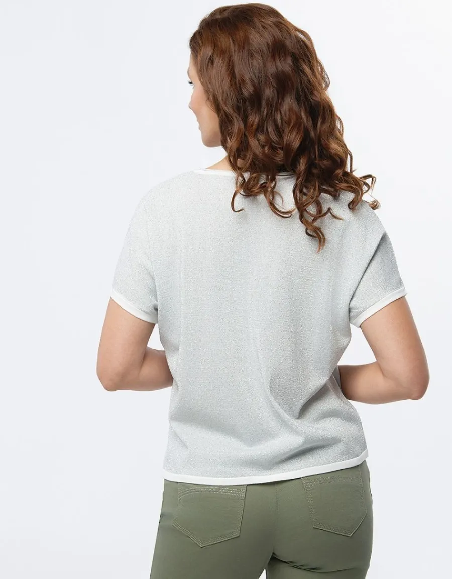 Le pull argenté à manches courtes de la marque Christine Laure est un choix élégant et contemporain pour votre garde-robe. Sa coupe droite assure un tombé fluide tandis que l’encolure ronde lui confère une allure classique et chic. Confectionné dans une maille fine et douce, ce pull offre un confort optimal tout au long de la journée. Le détail qui le distingue est une délicate broderie argentée au niveau de la poitrine, ajoutant une touche subtile de sophistication. Ce modèle est parfait pour passer d’une journée décontractée à une soirée plus habillée, se mariant facilement avec un jean ou une jupe. Avec une longueur de 59 cm pour la taille 1, il s’adapte à différentes morphologies tout en mettant en valeur la silhouette. Sa composition assure non seulement une douceur au toucher, mais garantit également une belle tenue. Kristel, mesurant 1,76 m, porte une taille 1, démontrant ainsi la polyvalence et l’adaptabilité de ce pull. Ce modèle est idéal pour celles qui recherchent un vêtement à la fois confortable et tendance, qui se démarque grâce à ses détails raffinés sans être ostentatoires.