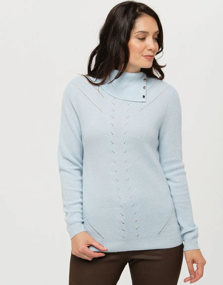 – Pull bleu clair à col boutonné