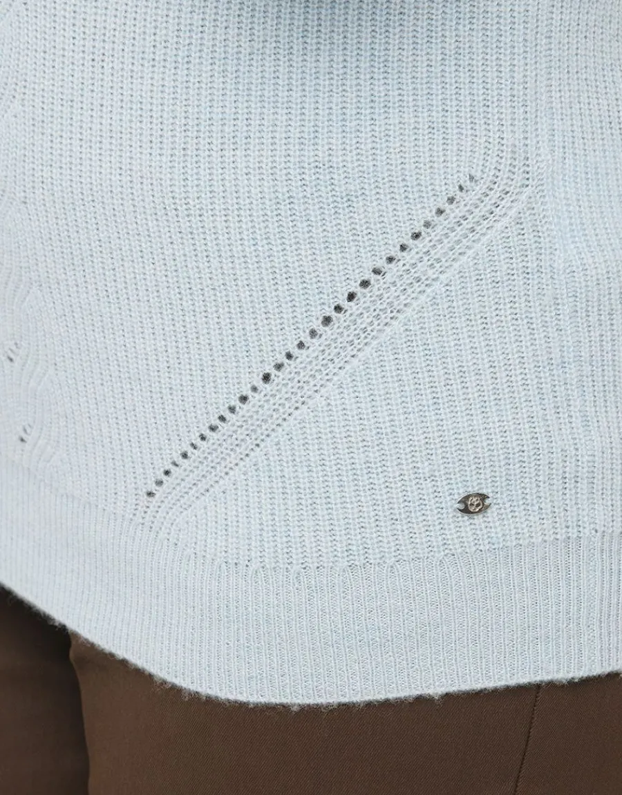 – Un col montant qui s’ouvre sur l’épaule, un bleu pastel lumineux et une belle matière douce et chaude : le pull de l’hiver