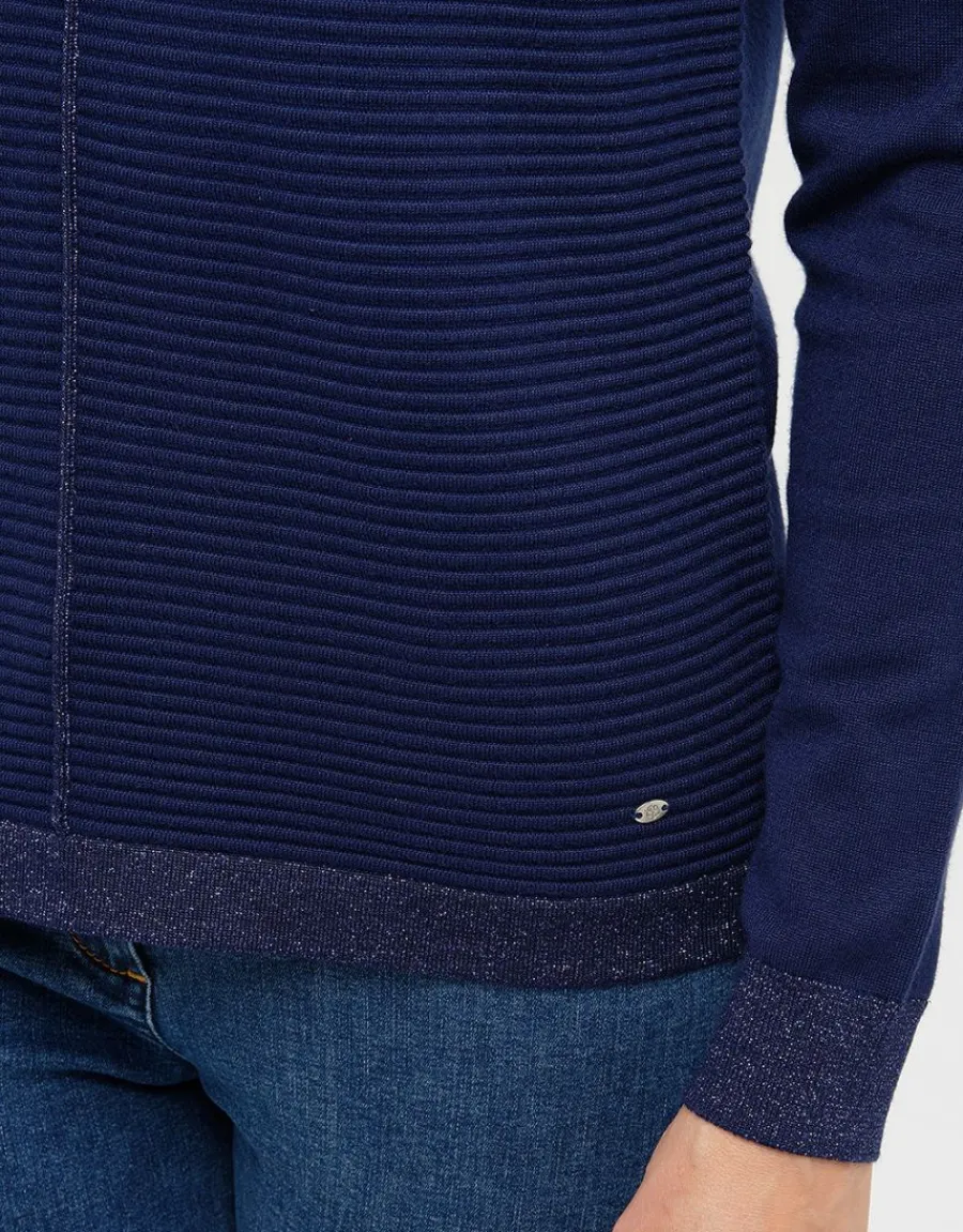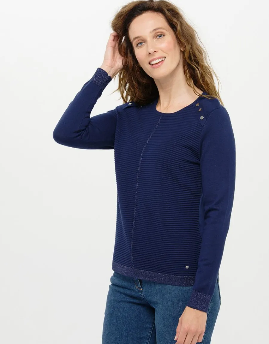 Ce pull bleu marine à rayures est un incontournable de votre garde-robe. Sa coupe droite sans ampleur mettra en valeur votre silhouette, tandis que les coutures apparentes et les empiècements boutonnés ajoutent une touche d’originalité. L’encolure ronde avec faux boutonnage sur les épaules apporte une touche de sophistication à ce pull classique. Les manches longues vous tiendront chaud lors des journées fraîches, tandis que la maille avec des détails fils métallisés apporte une touche de brillance subtile. Le bleu marine intemporel de ce pull est relevé par l’effet « rayures en relief » présent sur l’avant, ajoutant une dimension supplémentaire à ce vêtement. Parfait pour une tenue décontractée mais élégante, ce pull s’adaptera à toutes les occasions. Que vous le portiez avec un jean pour un look décontracté ou avec une jupe pour une tenue plus habillée, ce pull sera un indispensable de votre dressing. La composition de ce pull est un mélange de polyamide, viscose, polyester et fibres métallisées, assurant à la fois confort et qualité. Sa longueur de 60 cm du haut de l’épaule jusqu’en bas pour la première taille conviendra à toutes les morphologies. La mannequin mesure 1,76m et porte du 38, mettant en valeur la polyvalence de ce pull qui s’adaptera à toutes les tailles. Ajoutez une touche de glamour à votre tenue avec ce pull bleu marine rayé, parfait pour toutes les saisons. Que ce soit pour une journée au bureau, une sortie entre amis ou une soirée romantique, ce pull sera votre allié mode incontournable. N’hésitez plus et laissez-vous séduire par ce pull à la fois classique et tendance, qui deviendra rapidement un incontournable de votre dressing.
