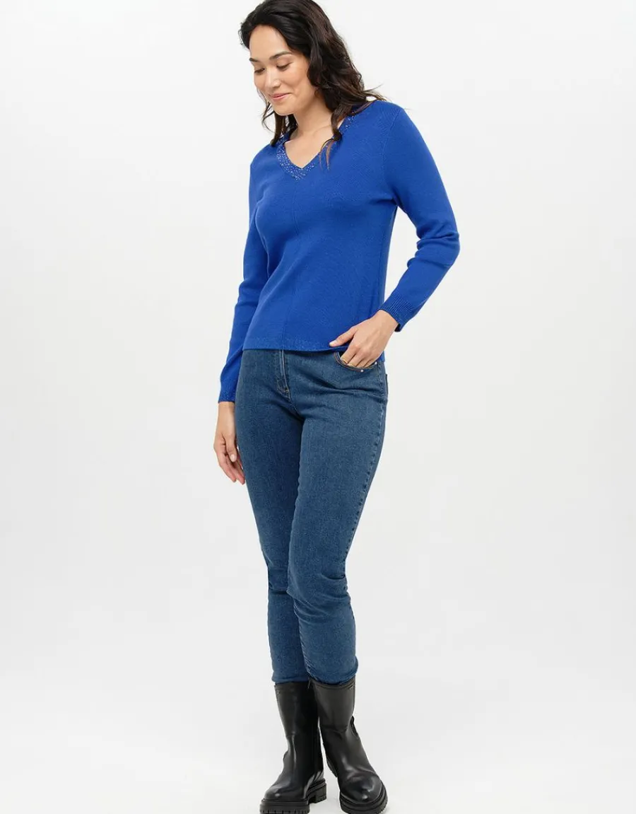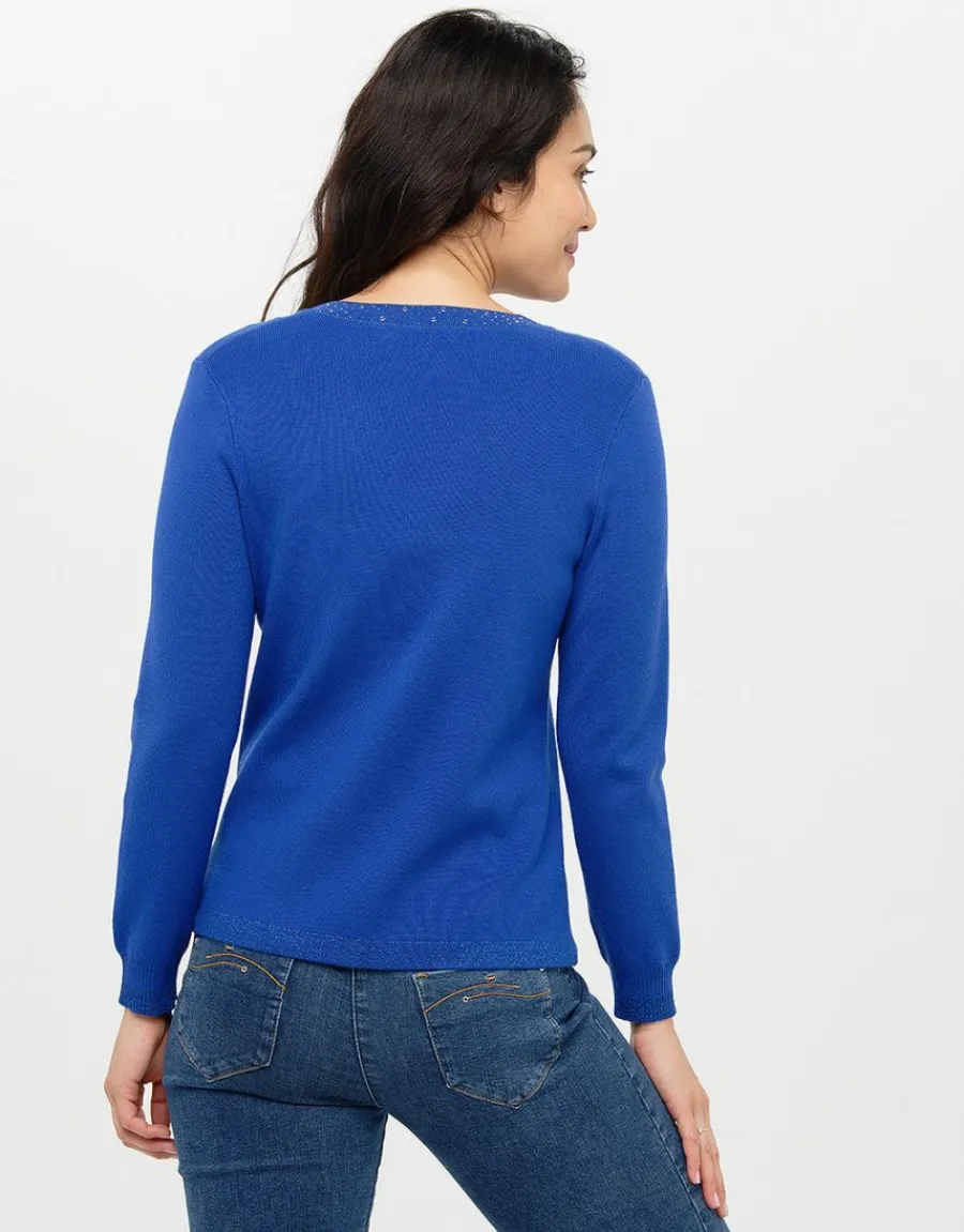 Ce magnifique pull bleu roi col irisé à décor perlé est un véritable bijou de la garde-robe hivernale. Sa coupe droite est sublimée par une bande métallisée à la base, ajoutant une touche d’éclat à l’ensemble. L’encolure en V se prolonge en une couture centrale, mettant en valeur le décolleté avec élégance. La maille de ce pull est agrémentée de détails fils métallisés, apportant une touche de brillance subtile. Les manches longues offrent une protection supplémentaire contre le froid, tout en restant confortables à porter. Les détails mode de ce pull sont tout simplement exquis : le décor de perles or et bleu qui souligne l’encolure et la couture centrale ajoute une touche de sophistication à l’ensemble. Ce pull est un véritable must-have pour la saison hivernale, créé dans une couleur éclatante qui réveille les gris et les marrons de l’hiver. Il apportera une touche de couleur et de style à n’importe quelle tenue. Que ce soit pour une journée au bureau ou une soirée entre amis, ce pull sera votre allié mode incontournable. La mannequin mesure 1,76m et porte du 38, mettant en valeur la polyvalence de ce pull qui convient à toutes les morphologies. Sa composition en viscose, polyamide, polyester et fibres métallisées garantit un confort optimal et une qualité irréprochable. Sa longueur de 60 cm du haut de l’épaule jusqu’en bas pour la première taille en fait un vêtement facile à assortir avec un pantalon ou une jupe. En résumé, ce pull bleu roi col irisé est un véritable bijou de la mode hivernale, alliant élégance, confort et style. N’hésitez plus et ajoutez-le à votre garde-robe pour un look tendance et sophistiqué en toute occasion.
