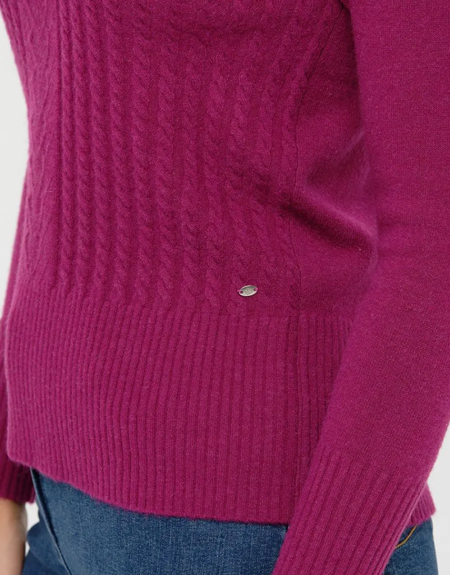 – Une belle réinterprétation du pull « irlandais » à torsades avec ce modèle à la ligne droite et à l’encolure dégagée totalement renouvelé par une couleur audacieuse