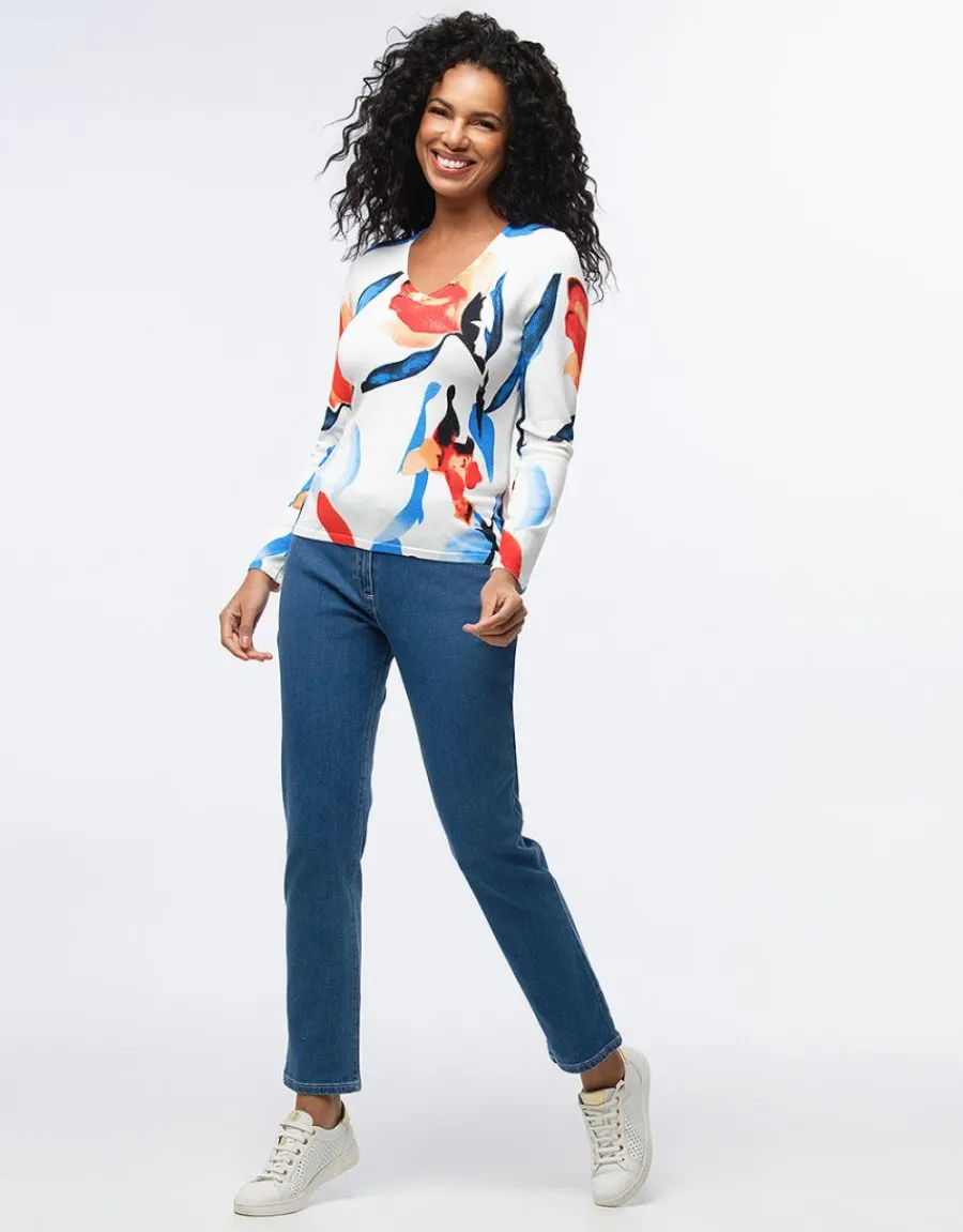 Ce pull fin à imprimé fleuri de la marque Christine Laure est une pièce idéale pour apporter une touche de fraîcheur à votre garde-robe. Confectionné en maille légère avec un tricotage jersey flammé, il offre un confort optimal tout au long de la journée. Son col en V met en valeur le décolleté tout en ajoutant une note de féminité à l’ensemble. La coupe droite assure une silhouette élégante, tandis que les manches longues apportent une chaleur agréable sans alourdir le look. L’imprimé fleuri coloré sur un fond écru donne au pull une apparence à la fois moderne et intemporelle, le rendant facile à associer avec différents styles. Juliana, mesurant 1,76 m, porte une taille 1, ce qui souligne la polyvalence de la taille. Avec une longueur de 58 cm pour la première taille, ce pull se prête parfaitement à un port sur un jeans ou une jupe. Il est conçu pour garder sa forme et sa douceur après plusieurs lavages, faisant de cette pièce un choix judicieux pour toute saison. Son design attrayant permet de le porter pour diverses occasions, que ce soit au bureau ou lors d’un rendez-vous décontracté.