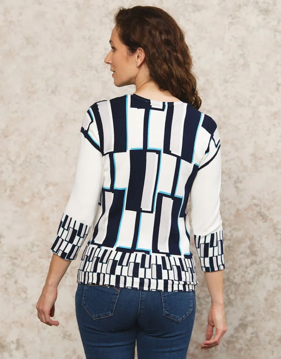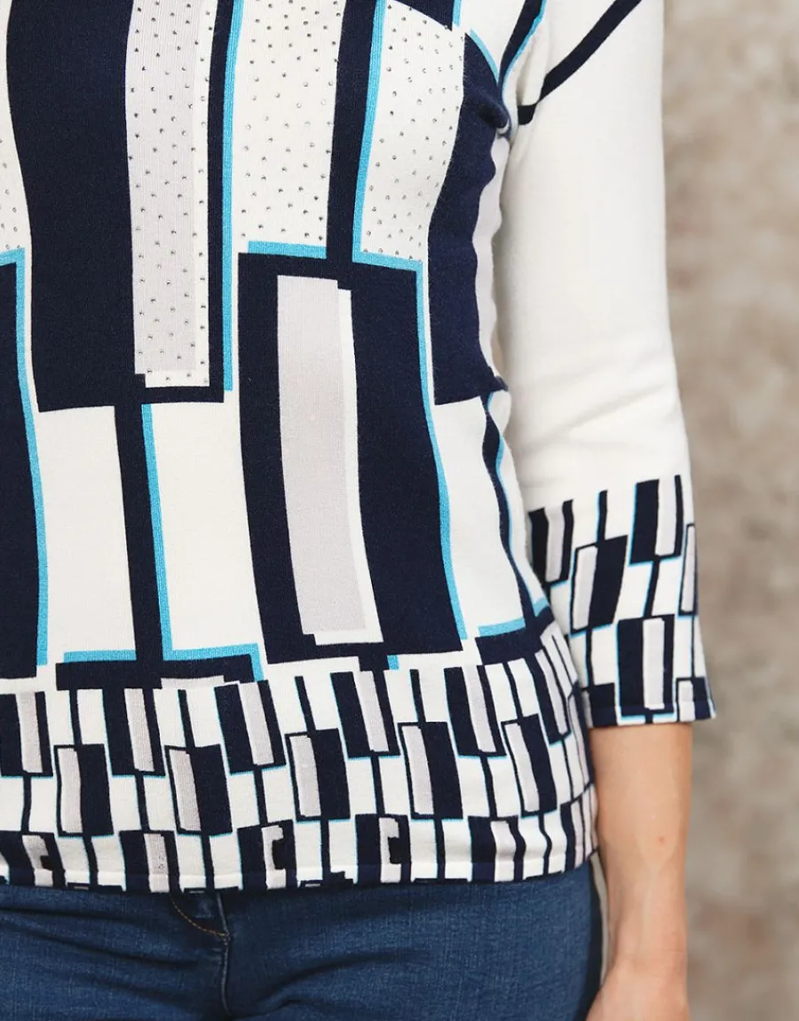 Découvrez le pull long écru en maille imprimé, avec une coupe droite et des manches 7/8 ème. Il possède une large encolure ronde, un fond écru et des motifs géométriques modernes marines et gris. Des strass au niveau de la poitrine apportent une touche de brillance à l’ensemble. Les petits bords-côtes au bas et aux manches ajoutent une finition élégante. La maille compacte est très douce et stretch, offrant un confort optimal. Ce pull est parfait pour apporter une touche de douceur à vos looks marins de l’hiver. Kristell, qui mesure 1,76m, porte une taille 1 de ce pull. Sa composition est de 80% viscose, 17% polyamide et 3% élasthanne. Sa longueur est de 59,5 cm pour la première taille. Ce pull long en maille blanc est un incontournable pour affronter l’hiver avec style et confort. Son design moderne et ses détails raffinés en font un choix idéal pour compléter votre garde-robe hivernale. Que ce soit pour une journée décontractée ou une soirée chic, ce pull saura vous accompagner avec élégance. N’hésitez plus et ajoutez cette pièce tendance à votre collection de vêtements pour un look à la fois sophistiqué et décontracté.