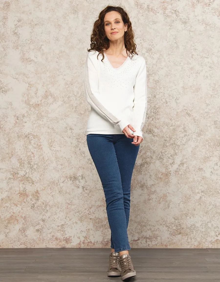 Le pull maille strass écru est un incontournable de la garde-robe féminine. Confectionné dans une maille douce et stretch, ce pull présente des détails ajourés et irisés le long des manches, sur les épaules et l’encolure, ajoutant une touche d’élégance et de sophistication à l’ensemble. La pluie de strass qui descend des épaules à la poitrine apporte une touche de brillance subtile, parfaite pour illuminer votre tenue. Sa coupe légèrement ample et ses manches longues avec bord-côte large et resserré offrent un confort optimal tout en restant tendance. L’encolure en V met en valeur le décolleté, tandis que l’effet bord-côte au bas apporte une finition soignée. Les finitions travaillées et les détails raffinés font de ce pull uni une pièce ultra féminine à porter en toute occasion. Avec une composition de 69% viscose, 29% polyamide, 1% polyester et 1% fibres métallisées, ce pull est à la fois doux, confortable et facile d’entretien. Sa longueur de 60 cm pour la première taille convient à toutes les morphologies. Que vous le portiez avec un jean pour un look décontracté ou avec une jupe crayon pour une allure plus sophistiquée, le pull maille strass écru sera votre allié mode de la saison. Mesurant 1,76m, Kristell porte une taille 1 et met en valeur la polyvalence de ce pull qui s’adapte à toutes les silhouettes. Ajoutez une touche de glamour à votre tenue avec ce pull maille strass écru et laissez-vous séduire par son style chic et féminin.