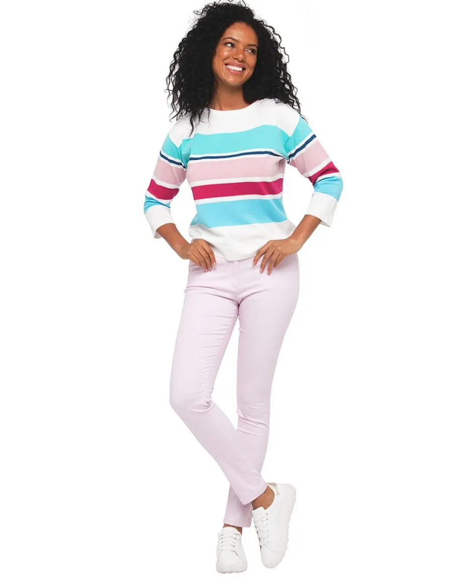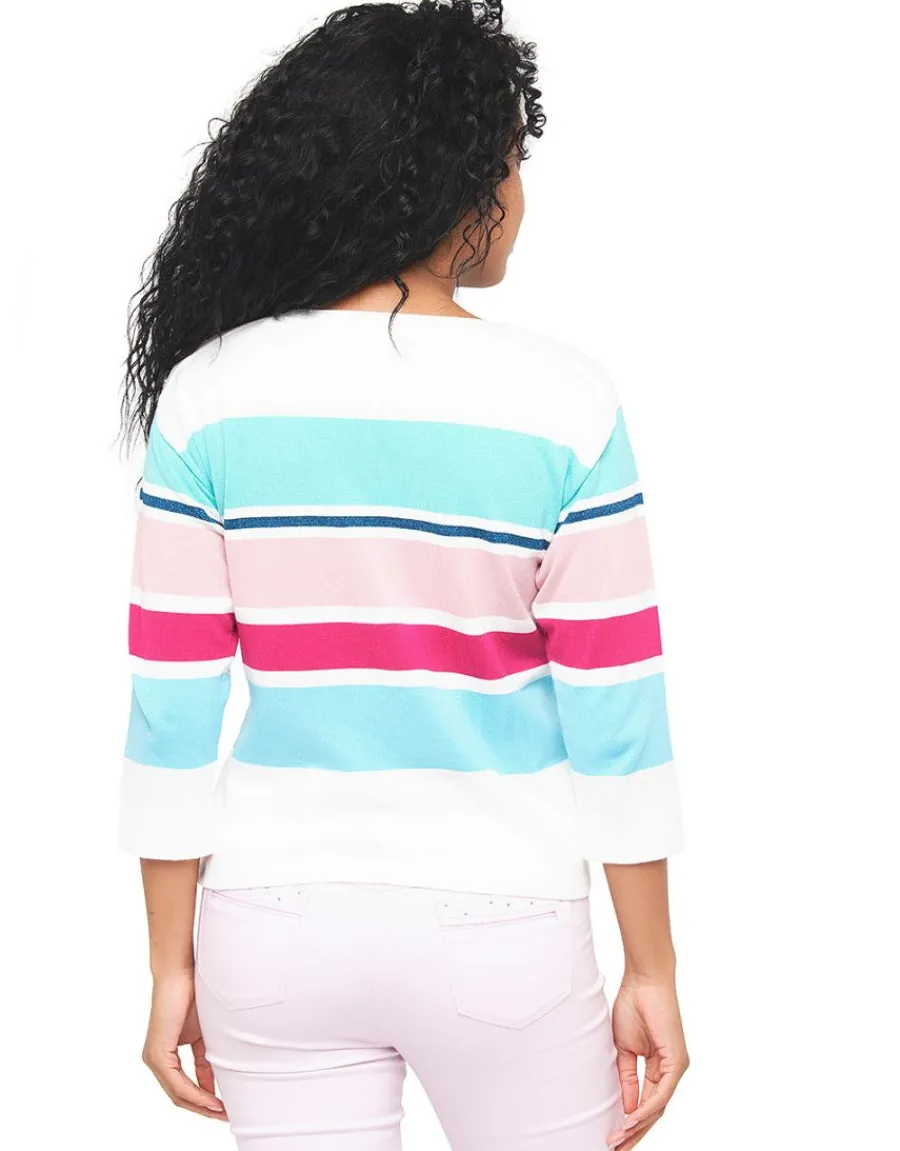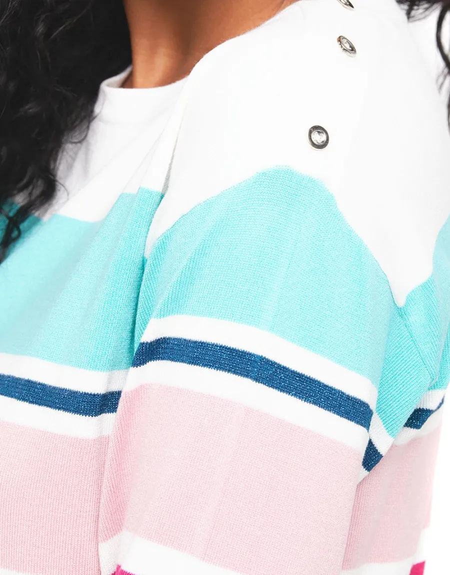 – Pull écru rayures multicolore bleu et rose