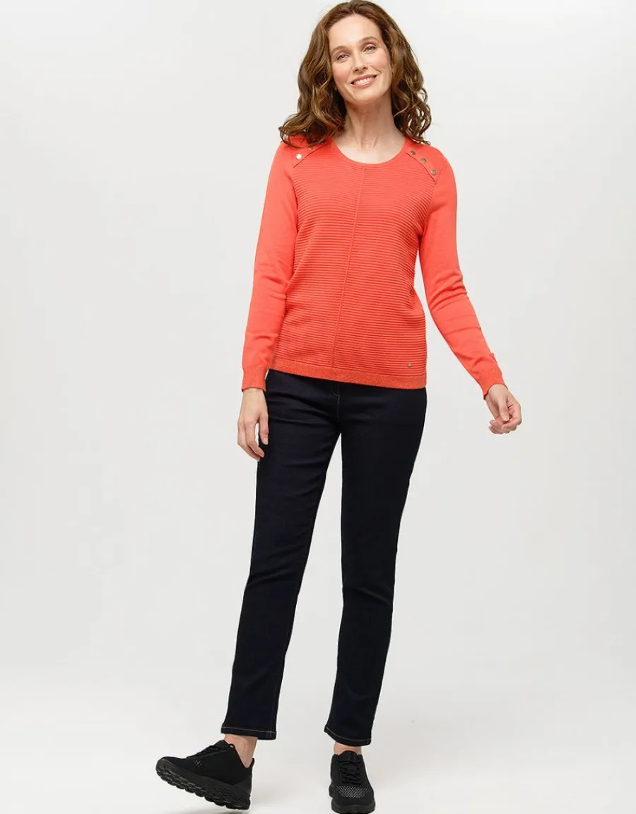 Le pull orange rayures est un véritable must-have pour la saison. Sa coupe droite et son encolure ronde avec faux boutonnage sur les épaules lui donnent une allure à la fois décontractée et sophistiquée. Les détails métallisés et les empiècements boutonnés ajoutent une touche d’originalité à ce pull déjà très tendance. Confectionné dans une maille de qualité, ce pull est à la fois confortable et élégant. Les manches longues et l’effet « rayures » en relief présent sur le devant lui confèrent un style résolument moderne et chic. La couleur orange lumineuse apporte une touche de bonne mine à n’importe quelle tenue. Porté par Kristell qui mesure 1,76m et porte du 38, ce pull s’adapte à toutes les morphologies. Sa composition en polyamide, viscose, polyester et fibres métallisées garantit une qualité et une durabilité exceptionnelles. Avec une longueur de 60 cm du haut de l’épaule jusqu’en bas pour la première taille, ce pull est parfait pour être porté avec un jean slim ou une jupe crayon pour un look casual chic. Que ce soit pour une journée de travail ou une sortie entre amis, ce pull orange rayures est le choix idéal pour être à la fois confortable et stylé. Ajoutez-le à votre garde-robe pour une touche de couleur et de modernité qui ne passera pas inaperçue.