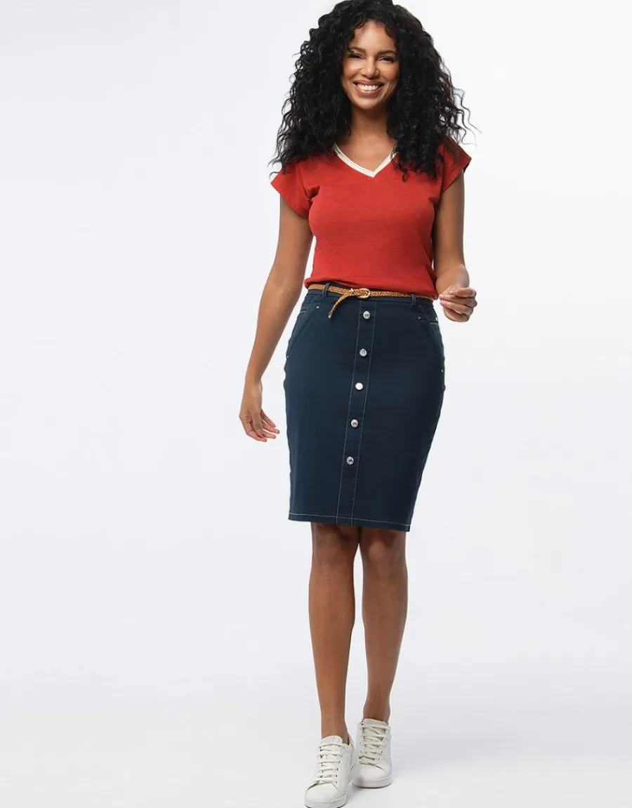 Cette jupe en coton effet jean de la marque Christine Laure allie confort et style contemporain. Sa coupe droite flatte la silhouette tout en assurant une aisance de mouvement. La ceinture plate, entièrement élastiquée, garantit un port agréable et un maintien optimal du dos, ce qui en fait un choix idéal pour un usage quotidien. Les deux fausses poches passepoilées ornées de rivets à l’avant ajoutent une touche de modernité à ce modèle, tout en conservant une allure élégante. Les cinq boutons argentés sur le devant, accompagnés d’un jeu de surpiqûres en bleu, beige et doré, sont des détails raffinés qui rehaussent le design global de la pièce. Réalisée dans un tissu stretch, cette jupe est composéede coton, offrant ainsi une sensation agréable au contact de la peau. Avec une longueur de 56 cm pour la première taille, elle se prête à de multiples occasions, qu’il s’agisse d’une sortie décontractée ou d’un événement un peu plus habillé. À noter que ce modèle est vendu sans la ceinture. Juliana, mesurant 1,76 m, porte une taille 1, ce qui illustre parfaitement le tombé de cette pièce intemporelle.