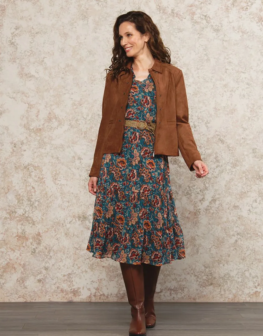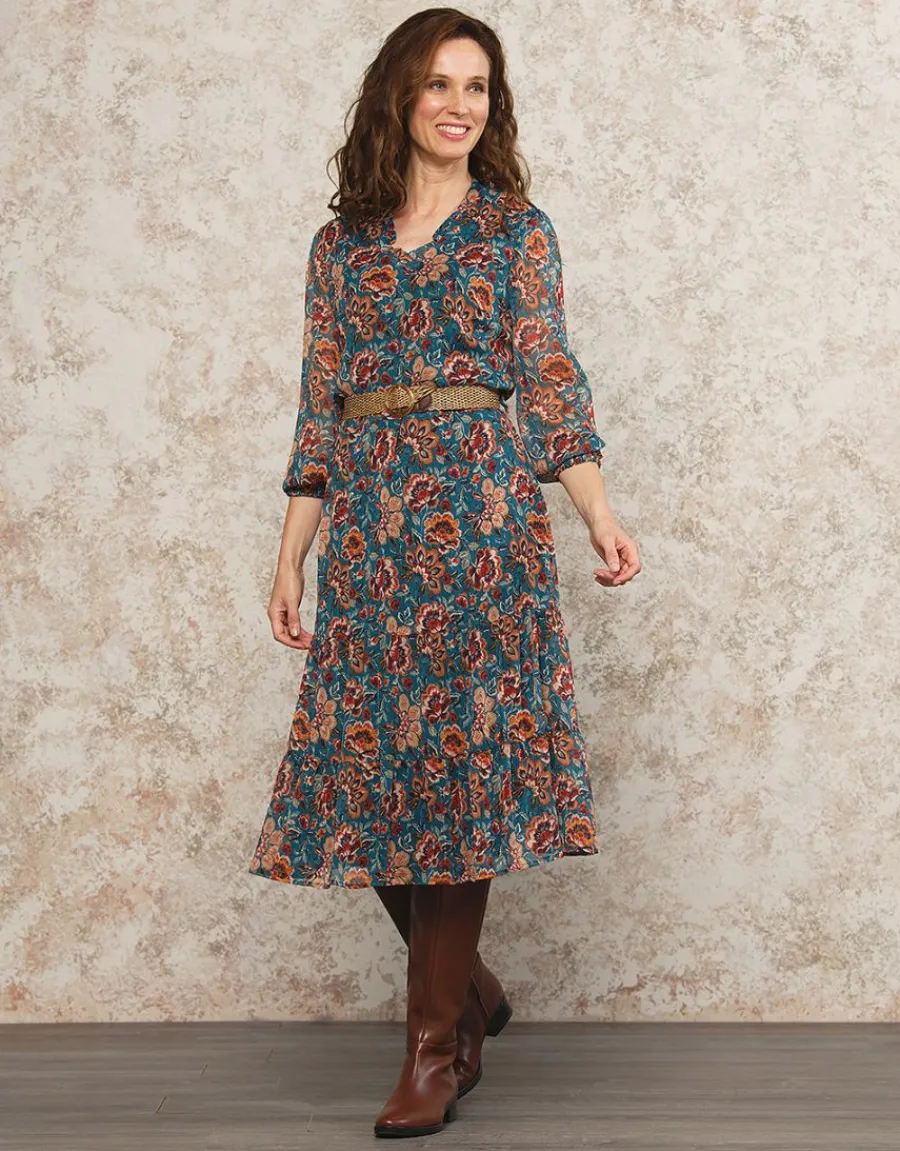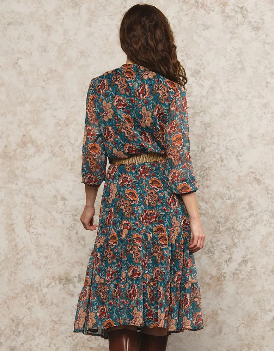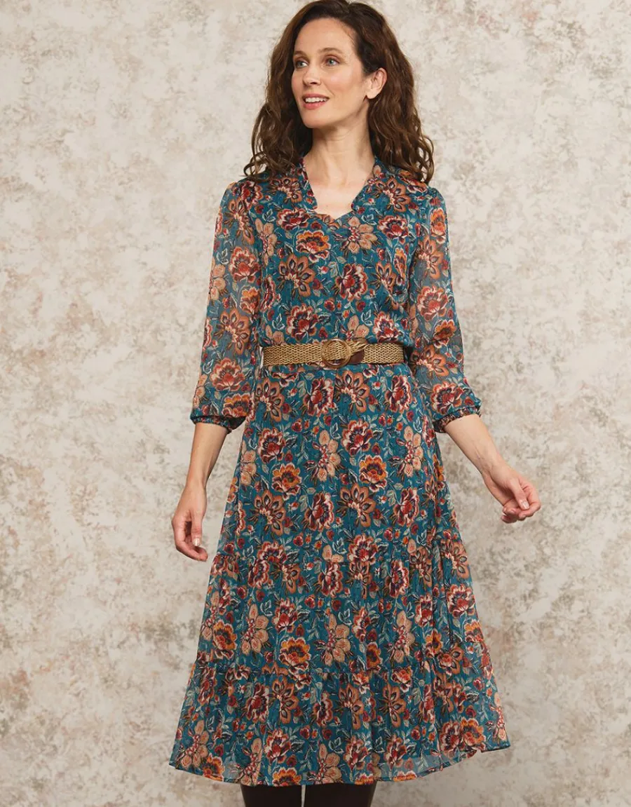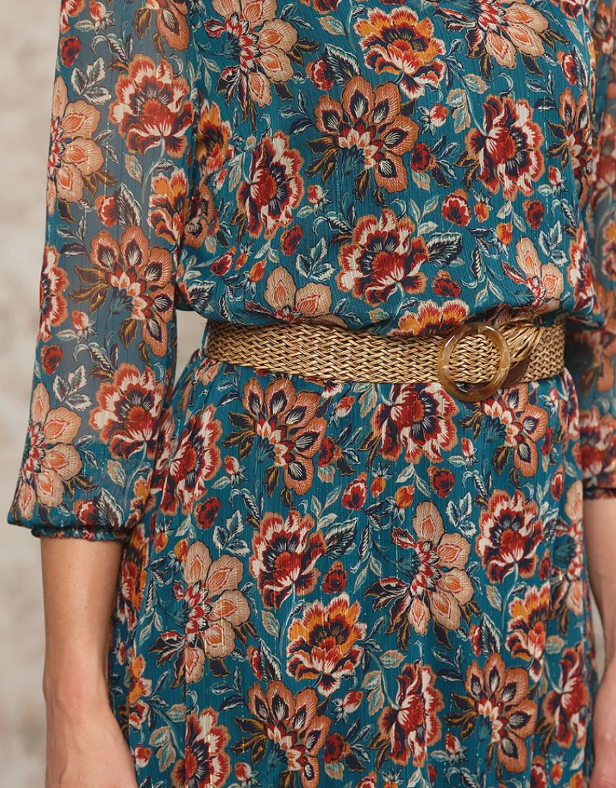 La robe longue motif bleu est un véritable bijou de la mode féminine. Avec sa coupe droite évasée au bas grâce aux volants, elle offre une silhouette élégante et féminine. L’encolure ronde avec son petit col se terminant en V apporte une touche de sophistication à l’ensemble. Les manches 3/4 en voile transparent avec un large élastique au bas ajoutent une touche de légèreté et de fluidité à la tenue. Le fond bleu de la robe est orné de motifs floraux oranges et rouges, créant un contraste saisissant et apportant une touche de couleur et de fraîcheur à l’ensemble. La ceinture tressée marron à grande boucle vient se nouer à la taille, mettant en valeur la silhouette et apportant une touche d’originalité à la tenue. Le corps de la robe est doublé pour un confort optimal et une opacité parfaite. Les fils dorés et le tissu léger et fluide apportent une touche de brillance et de légèreté à l’ensemble, parfait pour les journées ensoleillées ou les soirées estivales. Cette robe est un véritable coup de cœur pour les amateurs de style bohème chic, alliant élégance et décontraction avec brio. Portée par Kristell qui mesure 1,76m et porte du 38, elle saura mettre en valeur toutes les morphologies et sublimer chaque silhouette. Composée à 99% de polyester et 1% de fibres métallisées, cette robe longue motif bleu est à la fois confortable, résistante et facile d’entretien. Avec une longueur de 120 cm pour la première taille, elle conviendra à toutes les femmes en quête d’une tenue à la fois tendance et intemporelle. Que ce soit pour une journée au bureau, une soirée entre amis ou une escapade en ville, cette robe sera votre alliée mode incontournable.