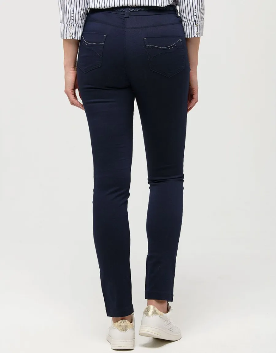 Le pantalon marine en coton est un incontournable de la garde-robe féminine. Sa coupe « jean » apporte une touche décontractée et tendance à toutes vos tenues. Avec ses détails brodés, ce pantalon slim est à la fois élégant et original. Sa taille légèrement basculée sur l’avant assure un confort optimal tout au long de la journée. Fabriqué dans un coton mélangé avec une touche de stretch, ce pantalon bleu est à la fois doux et résistant. Il est doté de 2 poches cavalières à l’avant et de 2 poches plaquées au dos pour un côté pratique. Les fines broderies argentées et bleues sur les poches ajoutent une touche de sophistication à l’ensemble. Ce pantalon marine coton est parfait pour un look « western urbain » qui saura vous démarquer avec style. Sa composition en 62% coton, 36% polyester et 2% élasthanne garantit une qualité irréprochable. Avec une longueur de 99 cm du haut jusqu’en bas pour la première taille, ce pantalon s’adapte à toutes les morphologies. Que vous le portiez avec un t-shirt basique pour un look décontracté ou avec une chemise pour une tenue plus habillée, ce pantalon marine coton sera votre allié mode en toutes circonstances. N’hésitez plus et ajoutez-le à votre dressing pour un style résolument moderne et tendance.
