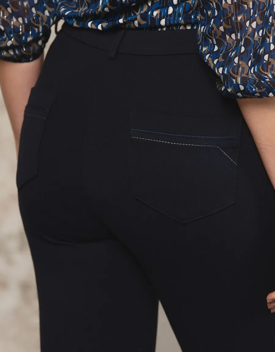 Découvrez le pantalon en maille Milano bleu marine, coupe slim, taille standard offrant un maintien parfait du dos et un effet ventre plat. Ce pantalon est doté de poches à l’avant et à l’arrière, de surpiqûres fantaisies argentées et de ganses satin. Les passants de 3 cm ajoutent une touche d’élégance supplémentaire. Toujours très apprécié, ce pantalon en Milano marine se distingue par sa sobriété et ses détails raffinés, mêlant satin et fils métallisés. Kristel, qui mesure 1,76m, porte une taille 38. La composition de ce pantalon est de 70% viscose, 26% polyamide et 4% élasthanne, pour un confort optimal. Sa longueur est de 98 cm pour la première taille. Ce pantalon slim Milano bleu est un incontournable de votre garde-robe, alliant style et confort pour une allure élégante en toute occasion.