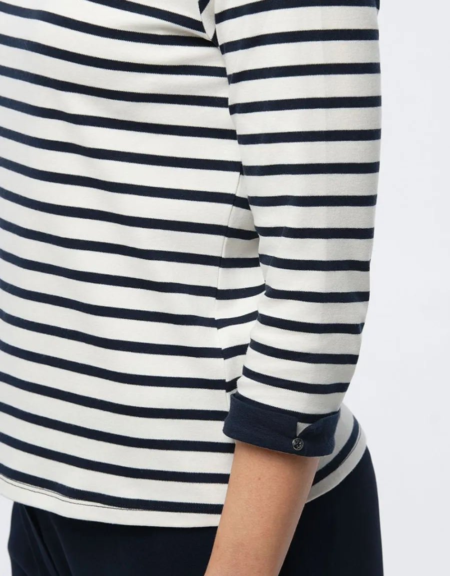La marinière en coton écru et bleu marine de la marque Christine Laure allie confort et élégance. Avec sa coupe droite, elle s’adapte facilement à toutes les silhouettes. L’encolure bateau souligne délicatement le cou, tandis que les manches 3/4 offrent une protection tout en légèreté. Les boutons élégamment positionnés sur la couture de l’épaule apportent une touche de sophistication, accentuée par le revers bleu marine en bas de manche, également agrémenté d’un bouton. Confectionnée dans une maille douce en coton, elle procure une sensation agréable au porter. Kristel, mesurant 1,76 m, porte une taille 1, ce qui illustre la polyvalence et le style de ce vêtement. Avec une longueur de 60 cm pour la première taille, cette marinière se combine aisément avec différents types de pantalons ou jupes, faisant d’elle un incontournable de votre garde-robe. Que ce soit pour une journée décontractée ou une sortie plus habillée, cette pièce se distingue par sa simplicité raffinée, offrant un choix idéal pour un look à la fois intemporel et moderne.