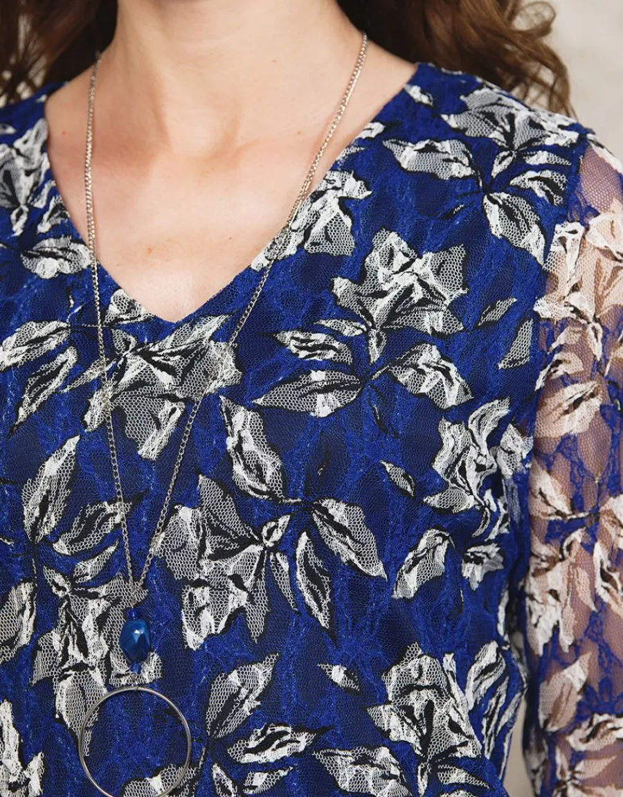 – T-shirt en dentelle bleue, noire et blanche à motifs