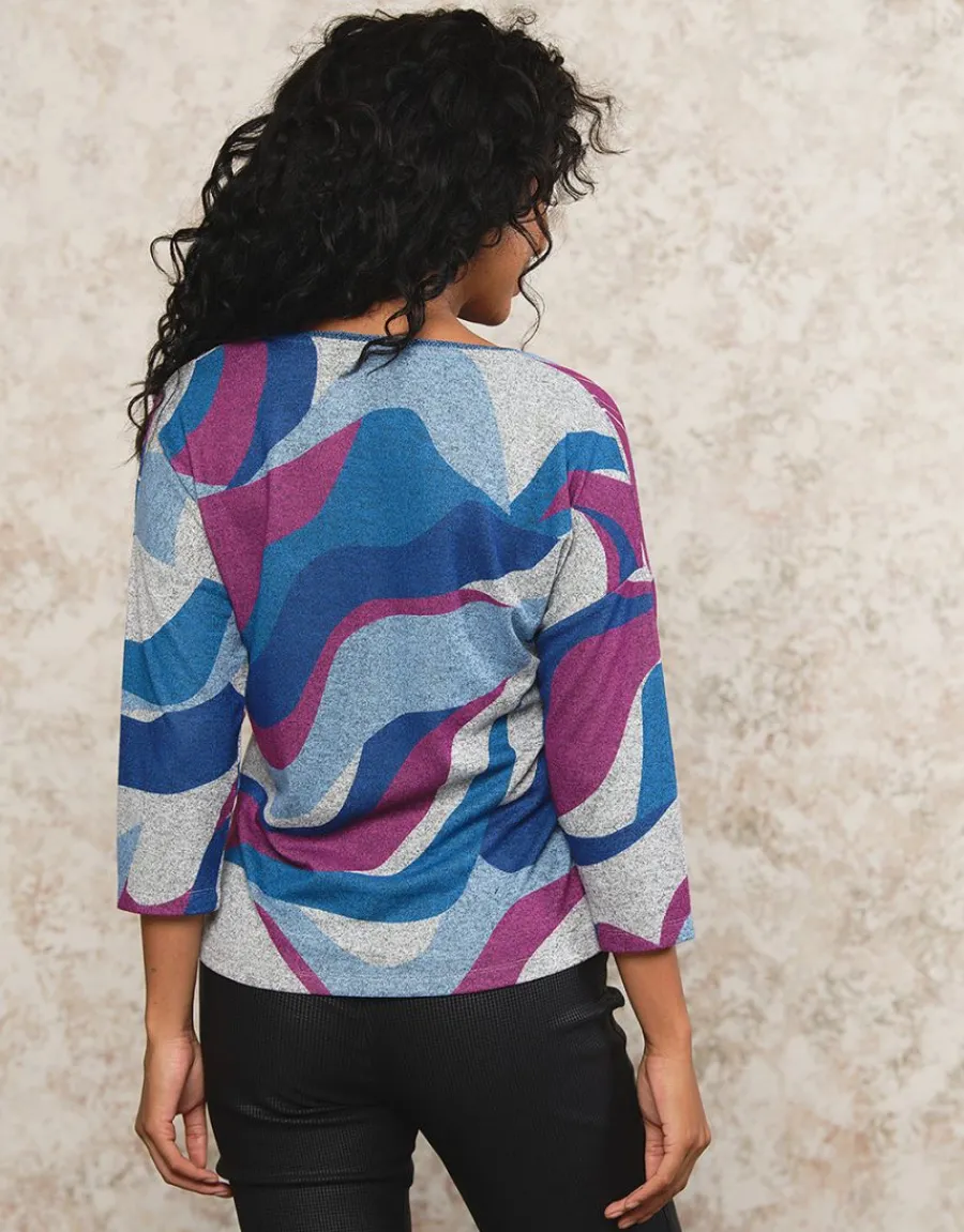 Le T-shirt doux motif gris est un incontournable de votre garde-robe. Avec sa coupe droite et ses manches chauve-souris 3/4, il offre un style décontracté et tendance. L’encolure en V avec liseré effet tricot ajoute une touche d’originalité à ce haut. Le fond gris est sublimé par un motif abstrait rappelant des vagues bleu et violet, ainsi que des imprimés argentés pour une touche d’éclat. Confectionné dans un tissu doux, léger et stretch, ce T-shirt vous offrira un confort optimal tout au long de la journée. Que vous le portiez avec un jean pour un look décontracté ou avec une jupe pour une tenue plus élégante, il s’adaptera à toutes vos envies. Disponible en plusieurs tailles, ce T-shirt est un véritable must-have pour toutes les fashionistas en quête de style et de confort. N’hésitez plus et ajoutez-le à votre dressing dès maintenant !
