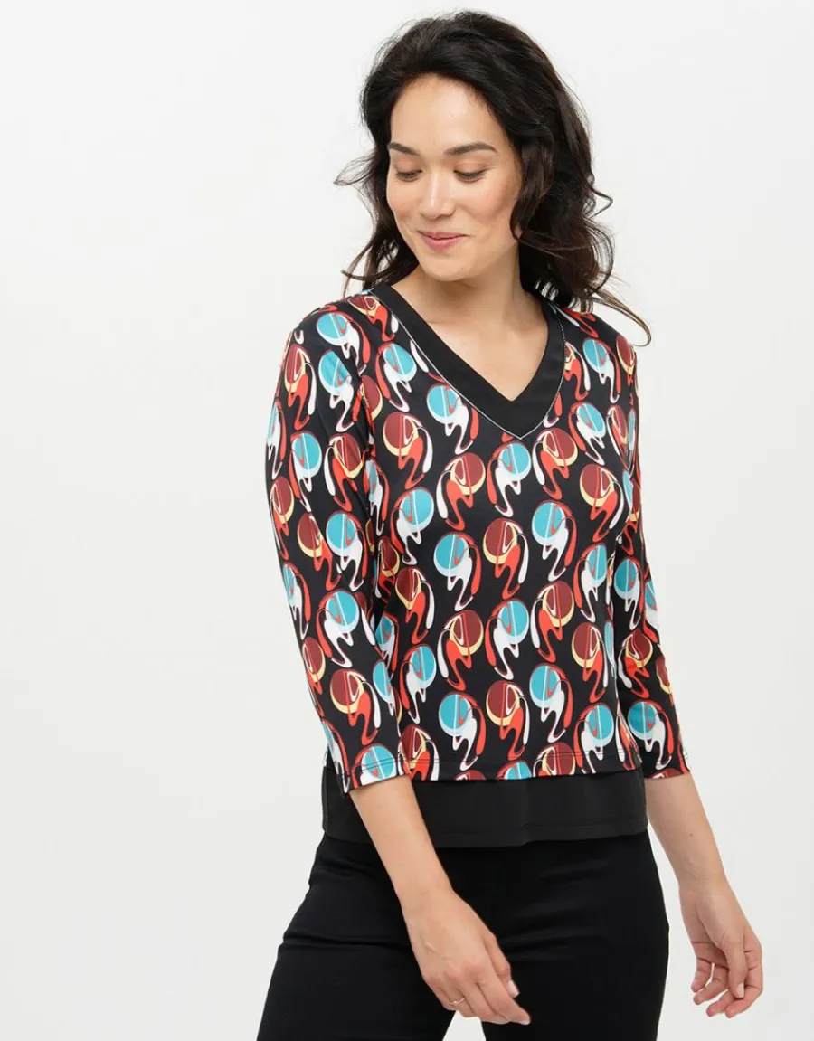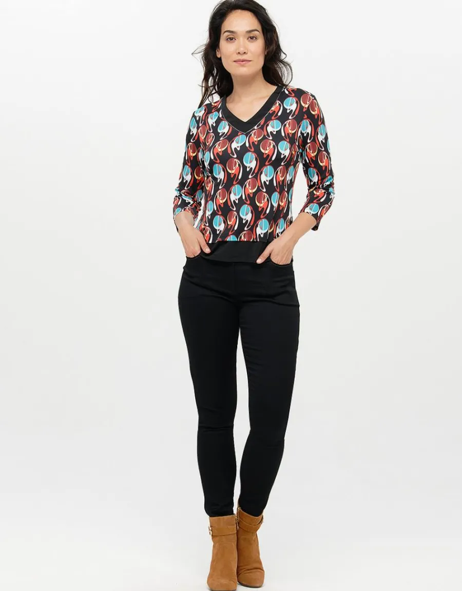 Découvrez ce Top fluide unique à dessins stylisés, le T-shirt noir à motifs est un incontournable de votre garde-robe. Sa coupe droite est rehaussée par une large bande noire à la base, apportant une touche d’originalité à ce vêtement. L’encolure en V est ornée d’une bande noire, ajoutant une note sophistiquée à l’ensemble. Confectionné en polyester stretch, ce T-shirt offre un confort optimal tout au long de la journée. Le fond noir du T-shirt est sublimé par des motifs multicolores représentant des cygnes stylisés dans des tons de terracotta, ciel et jaune. Les manches longues ajoutent une touche de chaleur à ce vêtement, parfait pour les journées fraîches. Le zoom mode met en avant l’effet de superposition créé par les bandes noires à l’encolure et à la base, soulignant le caractère unique de ce T-shirt. Facile à enfiler comme un tee-shirt classique, ce top fluide est idéal pour un look décontracté et tendance. Que ce soit pour une journée au bureau ou une sortie entre amis, ce T-shirt noir à motifs saura vous accompagner avec style. La mannequin mesure 1,76m et porte du 38, mettant en valeur la coupe flatteuse de ce vêtement. La composition de ce T-shirt est de 96% polyester et 4% élasthanne, offrant à la fois douceur et extensibilité. La garniture est quant à elle composée de 92% polyester et 8% élasthanne, assurant une finition de qualité. Avec une longueur de 59 cm du haut de l’épaule jusqu’en bas pour la première taille, ce T-shirt s’adapte parfaitement à votre morphologie pour une silhouette élégante et féminine. Optez pour le T-shirt noir à motifs pour un look original et tendance en toute occasion.