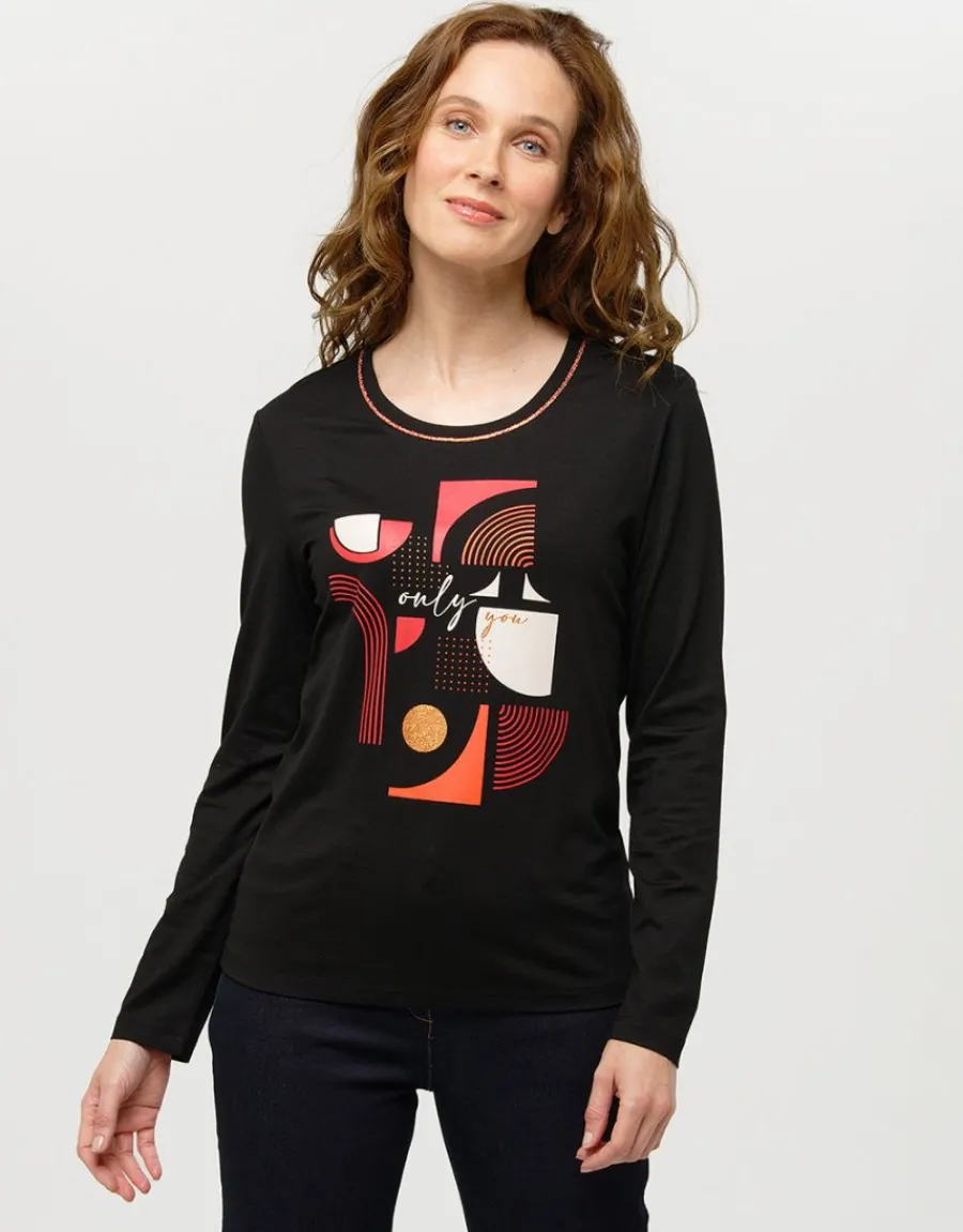 – Impeccable, le t-shirt à manches longues noir reste original avec son décor aux dessins pop sur l’avant