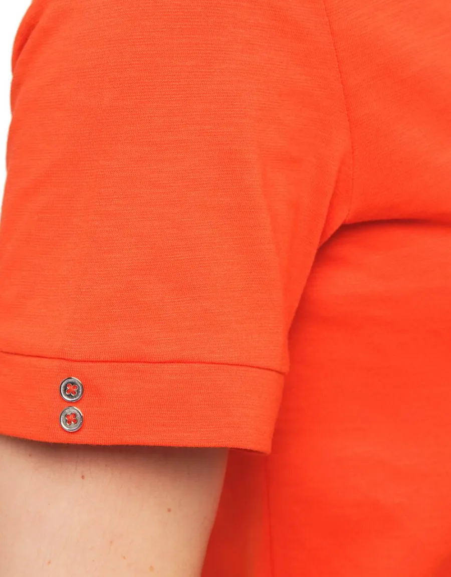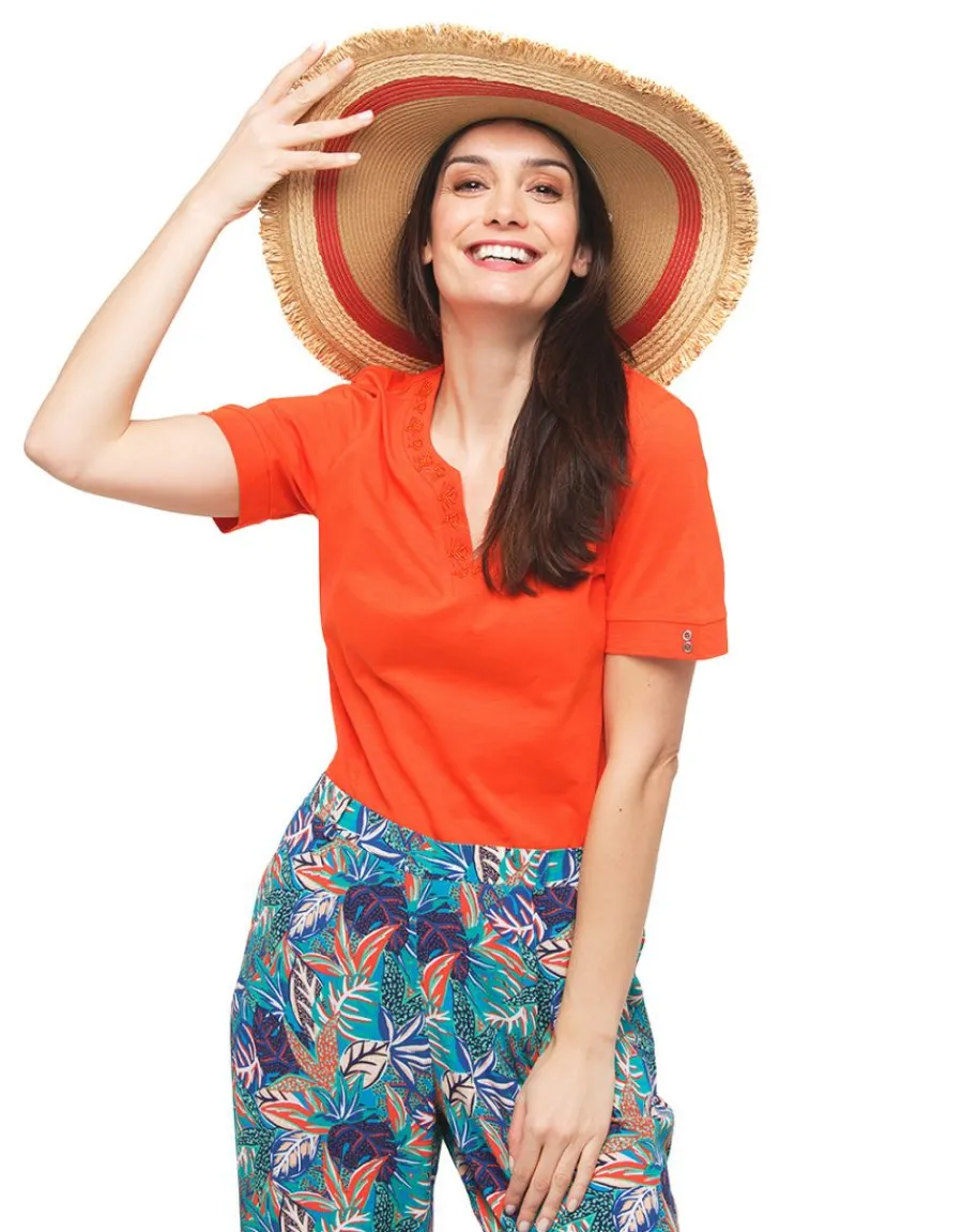 – Sobre mais raffiné, ce tee-shirt orange se pare de broderies ton sur ton pour un look casual chic