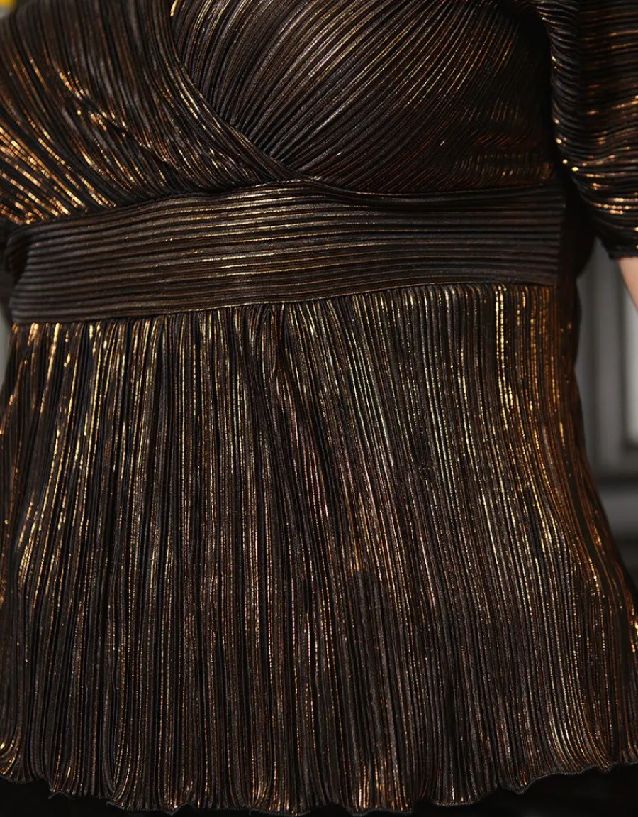 Le T-shirt plissé chic noir est un incontournable de votre garde-robe. Avec son col V et son style cache-coeur, il apporte une touche d’élégance à toutes vos tenues. La bande horizontale sous la poitrine et l’effet évasé au niveau de la taille mettent en valeur votre silhouette. Les manches courtes ajoutent une touche de modernité, tandis que le noir avec des fils cuivrés apporte une touche d’originalité. Conçu en 100% polyester, ce T-shirt est à la fois confortable et stylé. Que vous le portiez avec un jean pour un look décontracté ou avec une jupe pour une occasion spéciale, il saura s’adapter à toutes les situations. Mesurant 58 cm du haut de l’épaule jusqu’en bas pour la première taille, il convient à toutes les morphologies. Laissez-vous séduire par ce T-shirt plissé chic noir et affirmez votre style avec élégance.