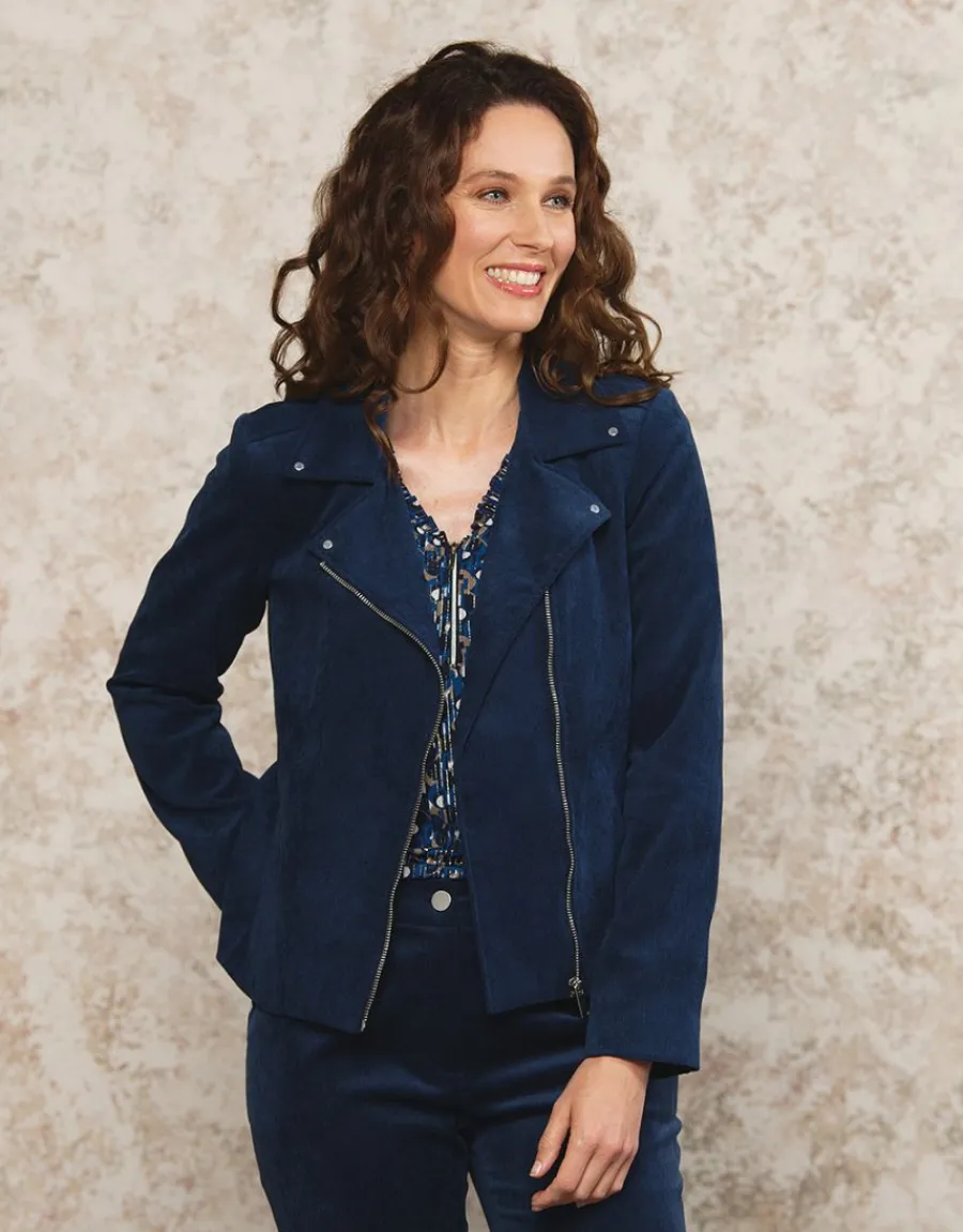 – Le velours fait son come-back en se déclinant dans un style blouson motard ! Parfait avec un jean ou en total look avec le pantalon en velours assorti