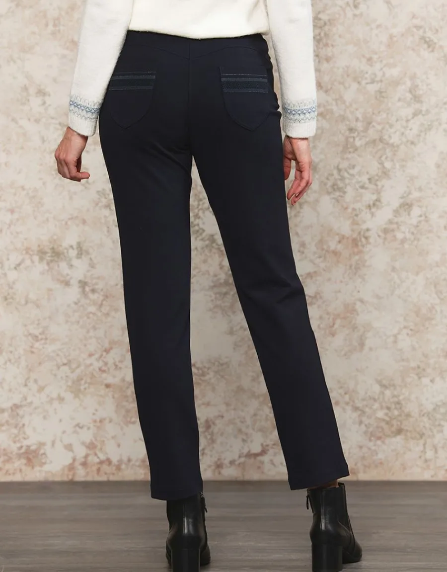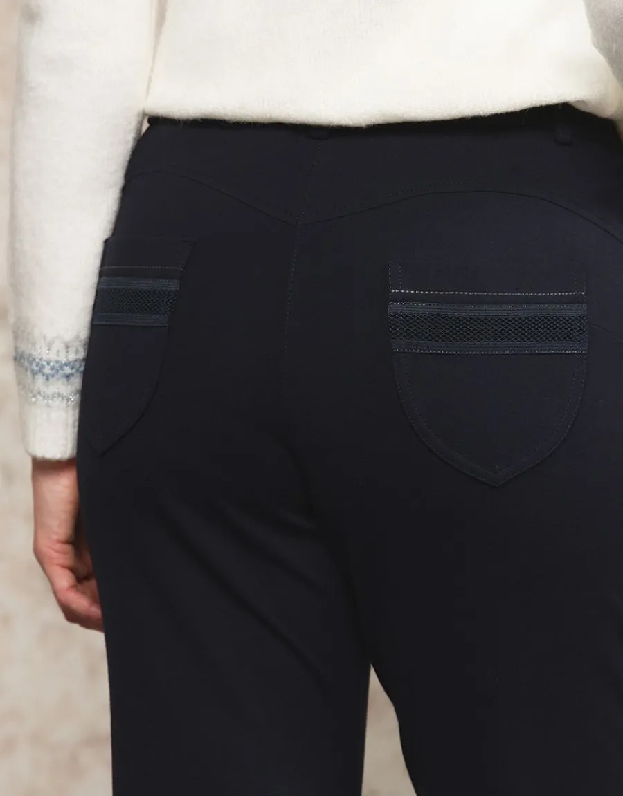 – Toujours apprécié, le pantalon en Milano marine se décline sur la forme jegging très appréciée. On craque pour le galon ton sur ton qui donne du relief aux poches devant et dos.