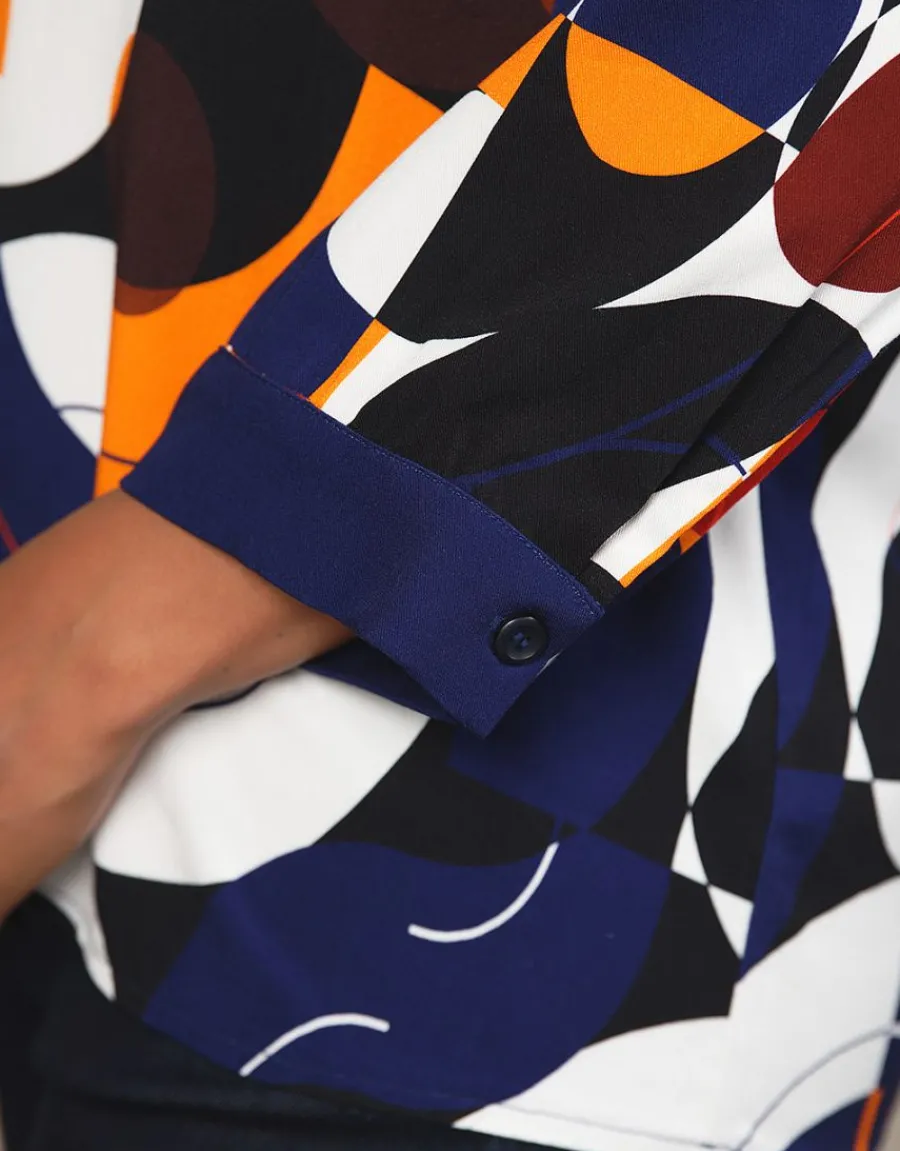 – Motifs géométriques bleus, oranges, rouges, blancs et noirs