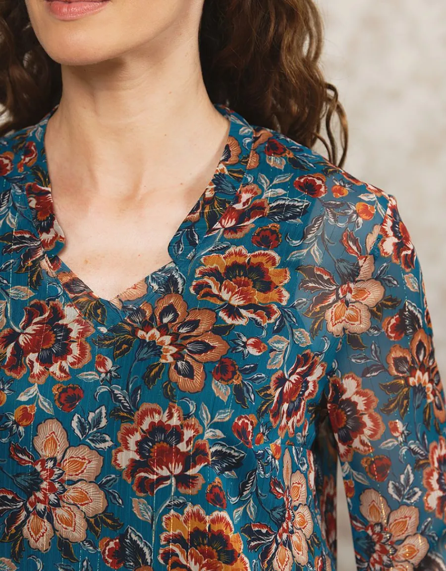 Laissez vous séduire par cette blouse bleue à motifs floraux rouges et marrons, cette pièce est un véritable coup de cœur pour les amoureux de l’esprit bohème. Sa coupe légèrement ample est sublimée par un élastique au bas qui crée un effet blousant très tendance. Le col V stylisé apporte une touche d’élégance, tandis que les manches longues voiles avec des smocks au bas ajoutent une note de féminité. Les fils dorés apportent une touche de brillance discrète à l’ensemble. Le fond bleu de la blouse met en valeur les motifs floraux rouges et marrons, créant un contraste harmonieux. Le corps de la blouse est doublé, tandis que les manches restent transparentes pour un jeu de transparence subtil. Les fronces dans le dos ajoutent du volume et du mouvement à la pièce, soulignant sa légèreté et sa fluidité. Confectionnée dans un tissu léger et souple, cette blouse est agréable à porter en toutes saisons. Son imprimé aux couleurs automnales se marie parfaitement avec un jean pour un look décontracté ou avec un pantalon camel pour une tenue plus sophistiquée. Kristell, qui mesure 1m75, porte une taille 1 pour mettre en valeur la coupe de la blouse. La composition de la blouse est majoritairement en polyester, avec une touche de fibres métallisées pour apporter une subtile brillance. La doublure en polyester garantit un confort optimal. Avec une longueur de 63 cm pour la première taille, cette blouse est idéale pour être portée rentrée dans un pantalon ou une jupe, ou laissée libre pour un look plus décontracté et fluide. En bref, cette blouse motif floral bleu est un véritable must-have pour celles qui recherchent une pièce à la fois tendance, féminine et facile à porter. Son esprit bohème et ses détails raffinés en font un indispensable de la garde-robe, à associer selon vos envies pour créer des looks variés et stylés.