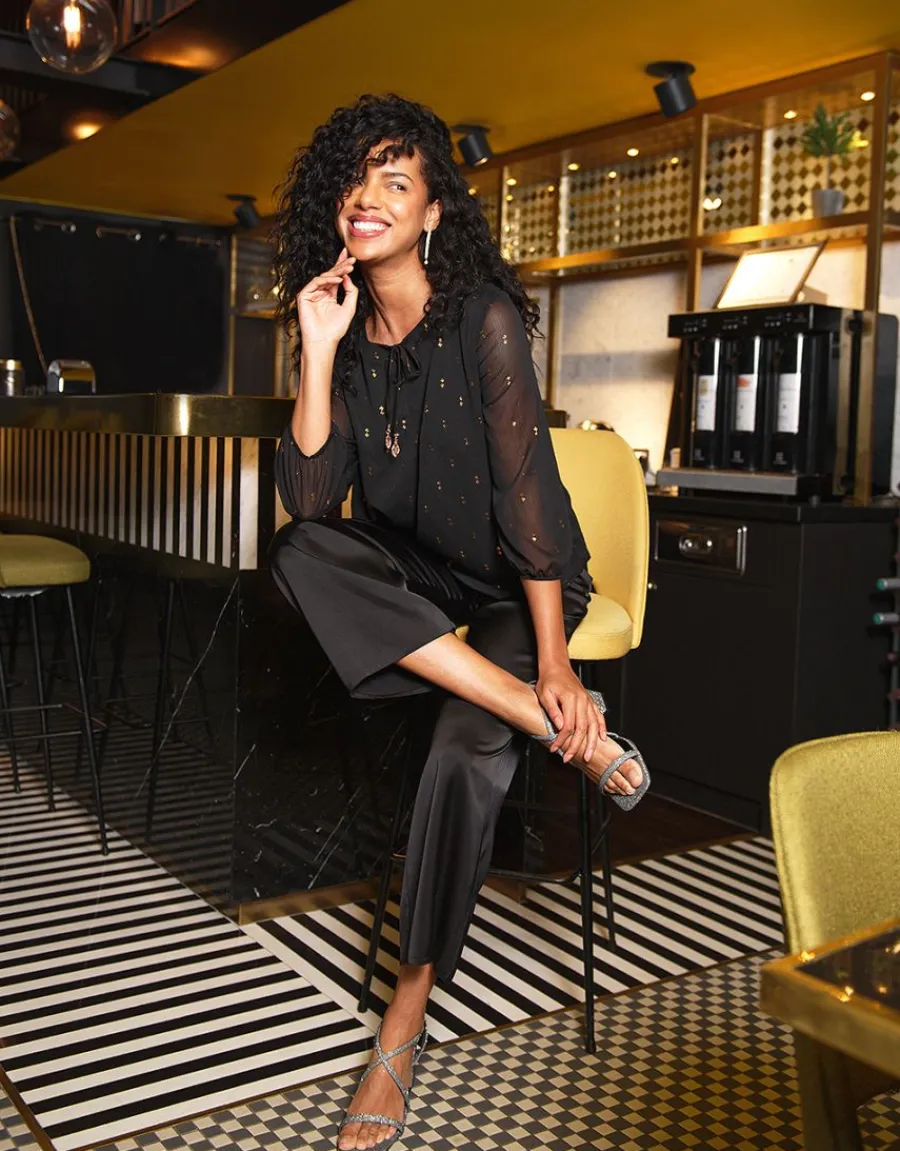 Cette blouse noire à motifs métallisés cuivre présente une coupe fluide qui épouse délicatement les courbes du corps. Sa large encolure ronde est agrémentée de liens à nouer terminés par des pampilles dorées, ajoutant une touche d’élégance et de féminité à l’ensemble. Confectionnée dans un voile de polyester léger, elle est ornée de petits motifs en fils cuivre qui lui confèrent un aspect raffiné et original. Les manches longues sont élastiquées en bas, apportant une note de confort et de modernité à ce vêtement. Pour un tombé impeccable, elle est dotée d’une doublure ton sur ton qui assure une opacité parfaite. Cette blouse se distingue par son association harmonieuse entre le noir intemporel et le métallisé cuivre lumineux. Polyvalente, elle peut être portée en mode casual avec un slim chocolat pour un look décontracté, ou plus chic avec une jupe droite noire pour une allure sophistiquée. Quelle que soit l’occasion, elle saura vous mettre en valeur avec style. Juliana, notre mannequin, mesure 1m75 et porte une taille 1. La composition de cette blouse est de 100% polyester pour un tombé fluide et léger. Sa doublure est également en polyester, garantissant un confort optimal. La longueur de la blouse est de 63 cm du haut de l’épaule jusqu’en bas pour la première taille, offrant une silhouette élancée et féminine. Optez pour cette blouse noire à motifs métallisés cuivre pour un look tendance et élégant en toutes circonstances. Son style unique et sa coupe flatteuse en font un indispensable de votre garde-robe.