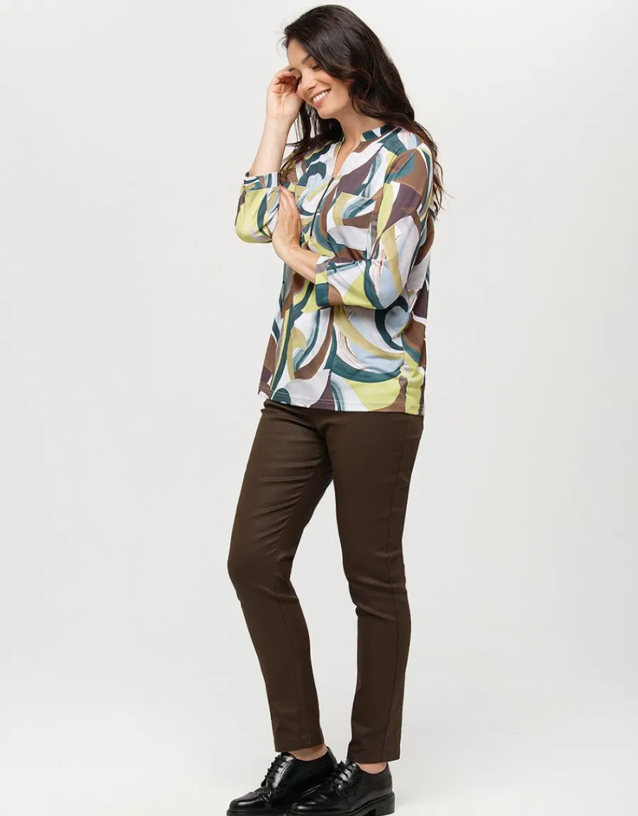 – Ambiance arty pour cette blouse dans des tons de vert et de marron qui ira parfaitement avec notre jean chocolat (E0543).