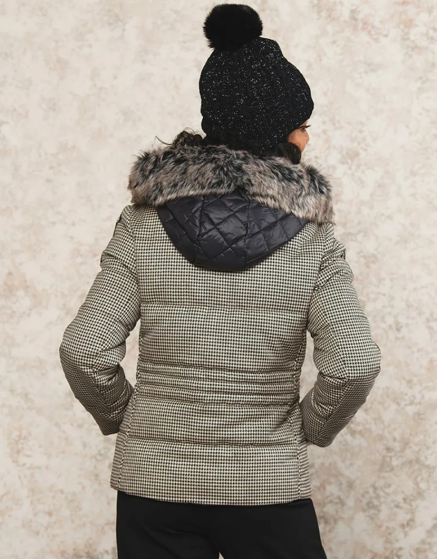 La « Doudoune pieds de poule » est un véritable bijou de la mode hivernale. Son imprimé pieds de poule noir et beige, rehaussé par des fils dorés, apporte une touche d’élégance et de sophistication à votre tenue. Sa coupe droite légèrement ajustée par un jeu de matelassage à la taille mettra en valeur votre silhouette tout en vous tenant bien au chaud. Cette doudoune courte est dotée d’une capuche et d’une fausse fourrure amovible, vous permettant de l’adapter à vos envies et à la météo. Les poches zippées à l’avant et le fond polaire vous offrent un confort optimal et une praticité au quotidien. Le contraste entre le doré et le vernis apporte une touche de brillance et de modernité à cette pièce incontournable de votre garde-robe d’hiver. Que ce soit pour une sortie en ville ou une escapade à la montagne, la « Doudoune pieds de poule » saura vous accompagner avec style et élégance. Kristel, qui mesure 1,76m, porte du 38 et met en valeur cette doudoune avec une aisance naturelle. Sa composition en viscose, polyester, fibres métallisées et élasthanne assure un confort optimal, tandis que la ouatine et la fausse fourrure en polyester vous tiendront bien au chaud même lors des journées les plus froides. Avec une longueur de 66 cm pour la première taille, cette doudoune est idéale pour affronter l’hiver avec style et féminité. Ne passez pas à côté de cette pièce tendance et chic qui saura vous accompagner tout au long de la saison froide.